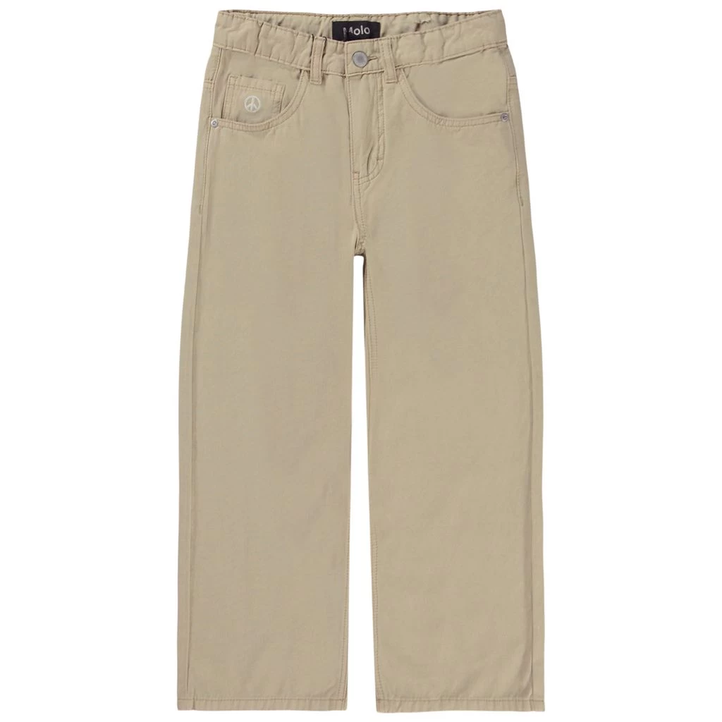 The pants are comfortable, casual and look great. Beige Aska trousers by Molo. The trousers have an adjustable button-elastic waist. They have a 5-pocket design and a zip fly with button.
