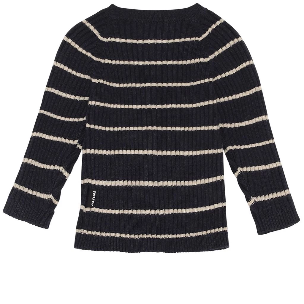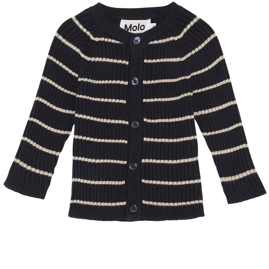 A soft cardigan with a striking new design. Navy Bendix cardigan by Molo. The cardigan has a ribbed design. It has a button closure at the front.