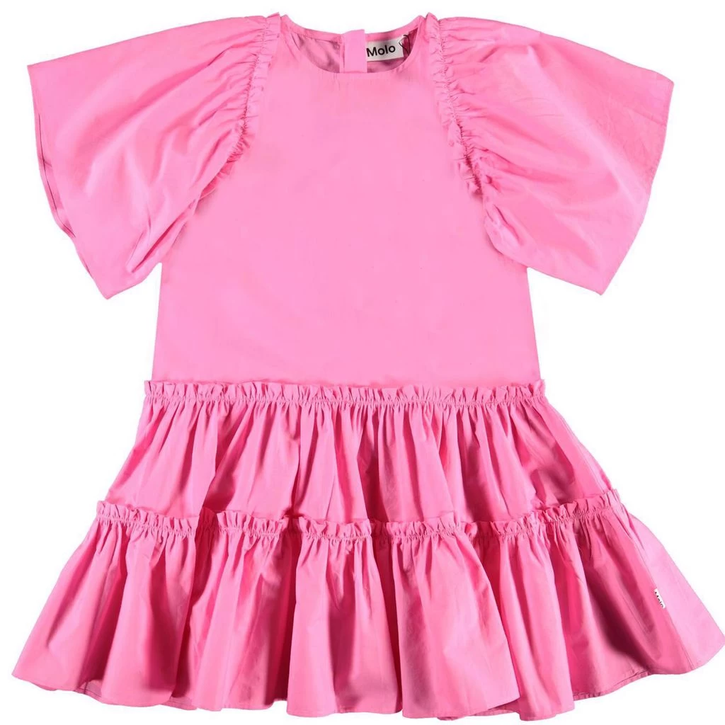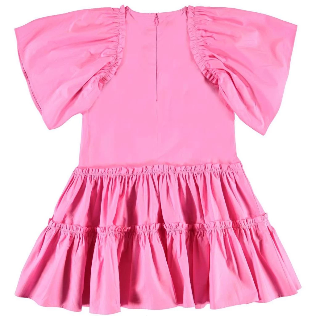 Pink Cat dress by Molo. The dress has a concealed zip closure at the back. It has a tiered skirt and ruffle details.