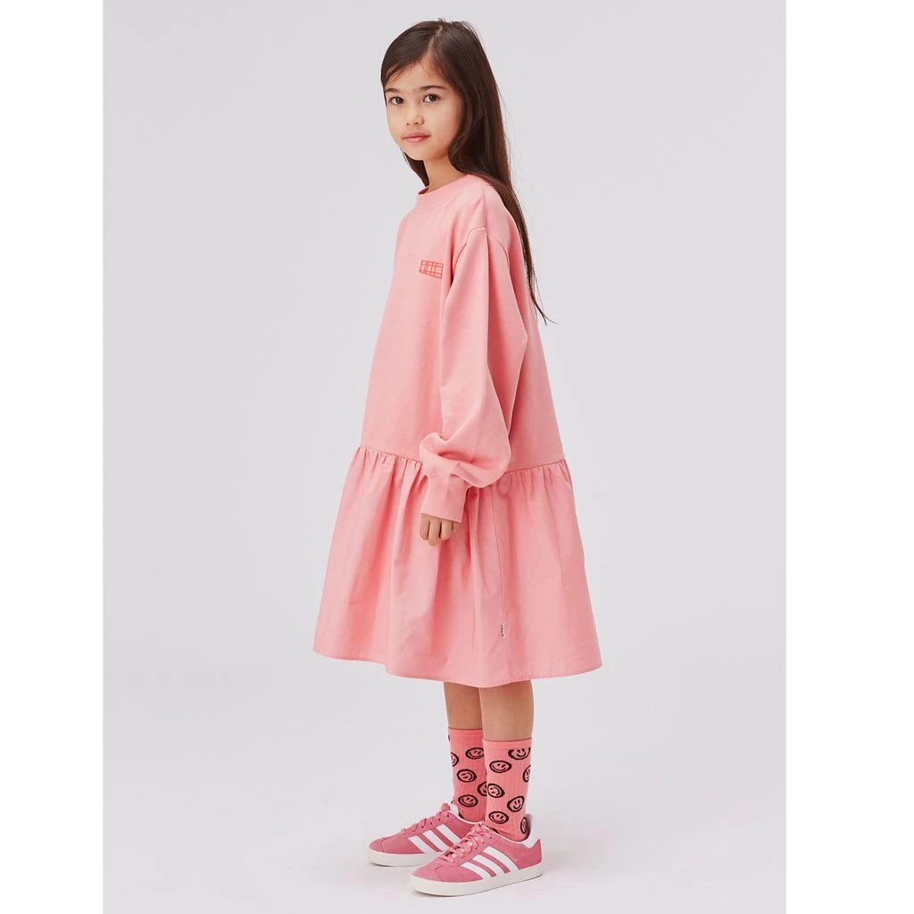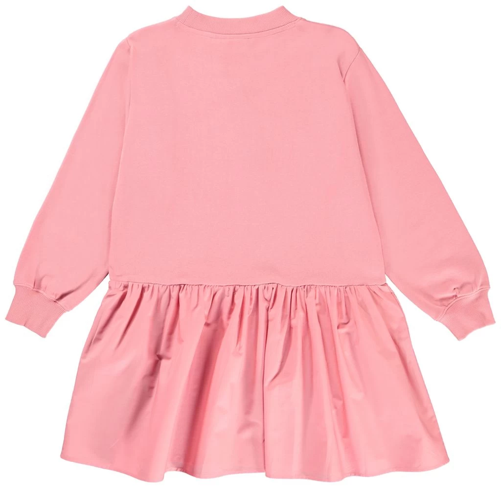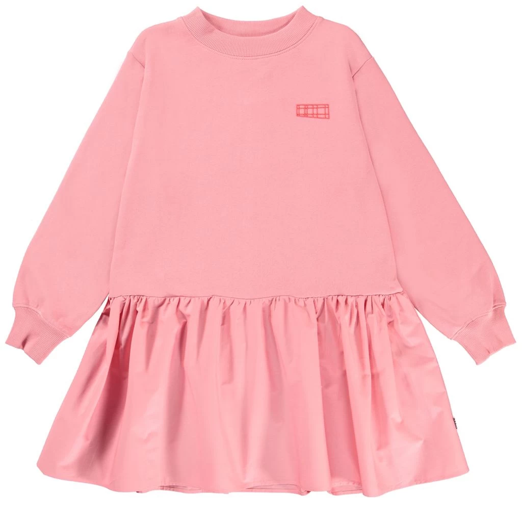 Pink Cecelia dress by Molo. The dress has a gathered waist.