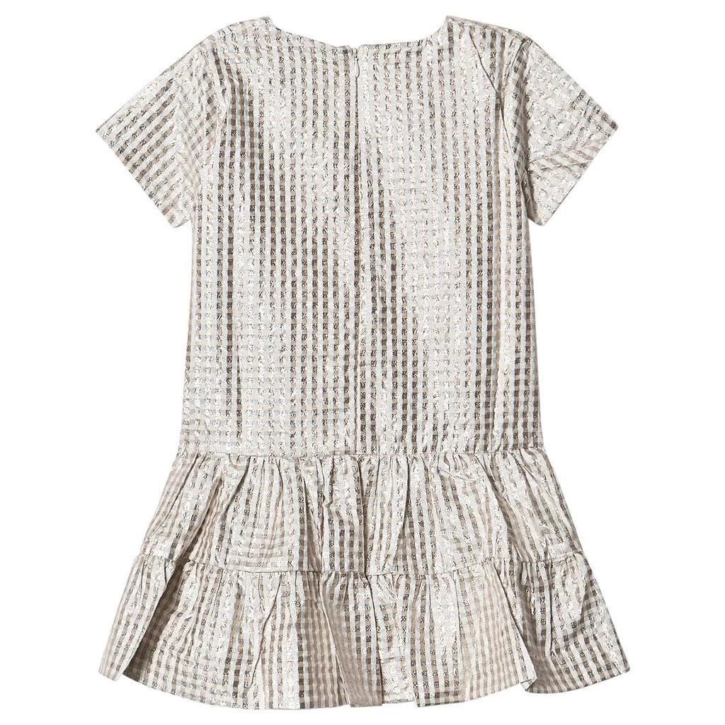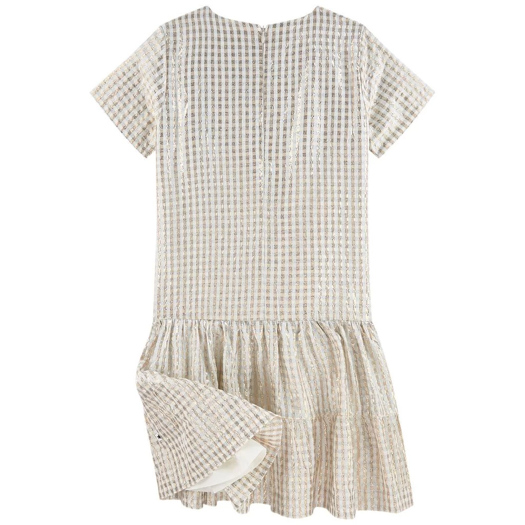 This golden easy-wear embellished woven dress by Molo is both cool and wearable. Crafted from soft and stretchy yarn and cotton, it has a zip back fastening and a metallic finish. Add the matching glittery party shoes, and tights or leggings for cooler days.