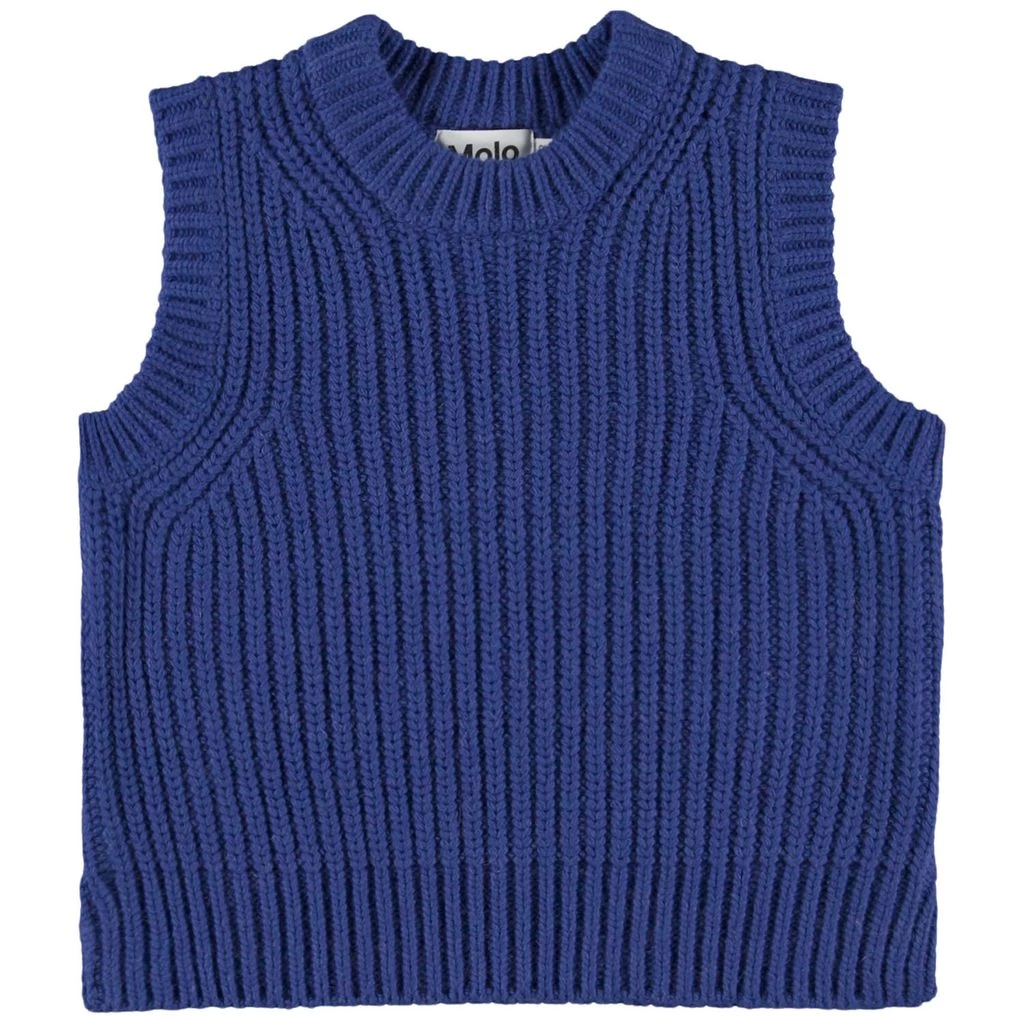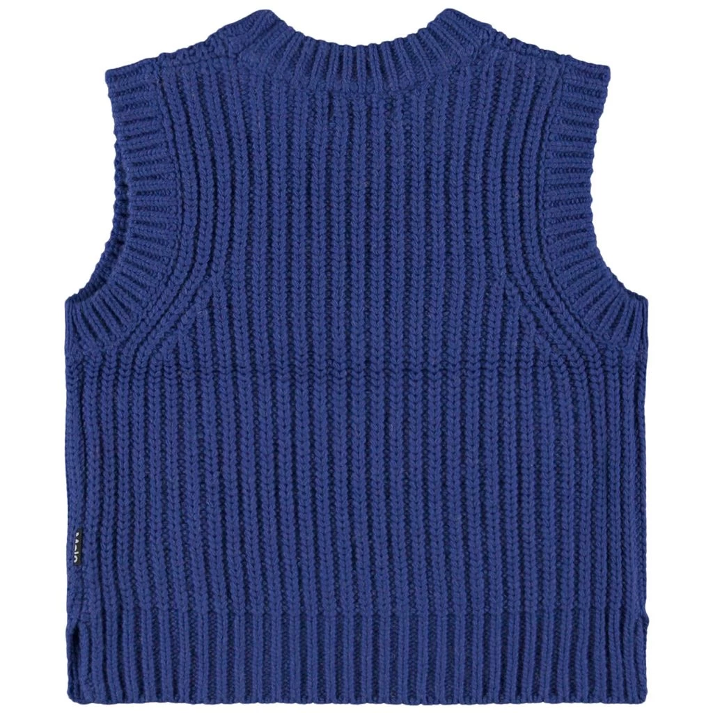 Enjoy the stylish design and soft knitted feel. Blue Gilberte gilet by Molo. The bodywarmer has a rib-knit design.
