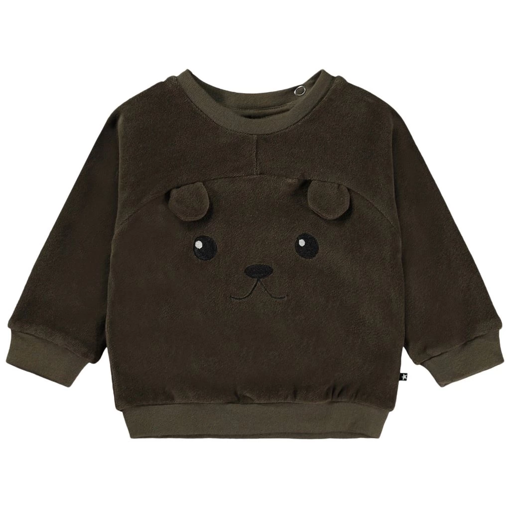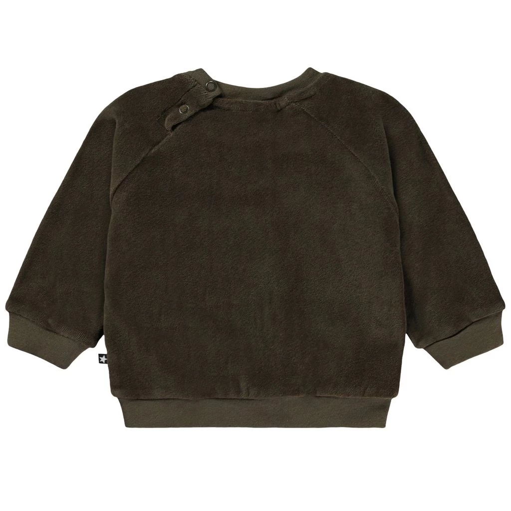 Get ready for play filled days. Brown GOTS Derry sweatshirt by Molo. The sweatshirt has a regular fit. It has snap buttons at the shoulder and ribbed cuffs.