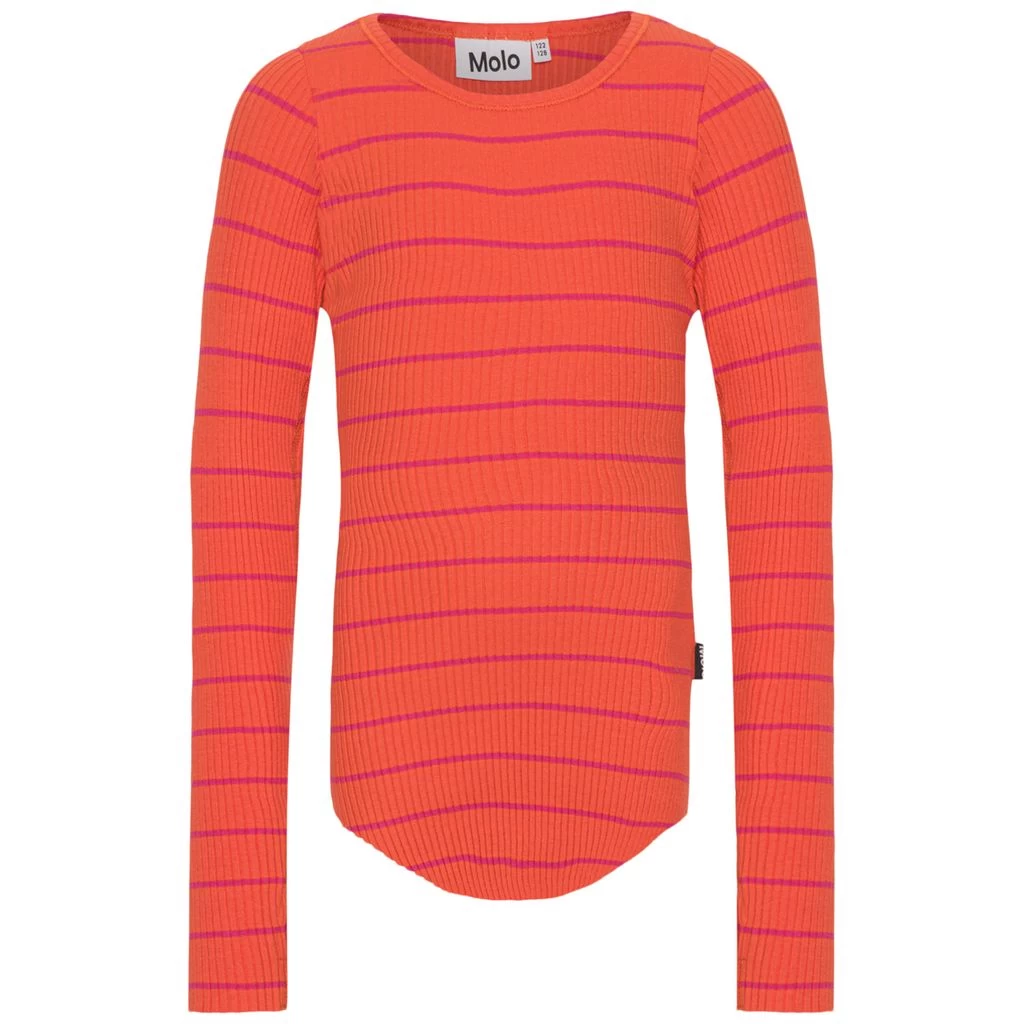Get ready for play filled days. Long sleeved, red GOTS Rochelle T-Shirt by Molo. The T-Shirt has a ribbed design.