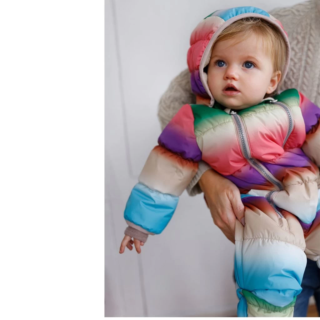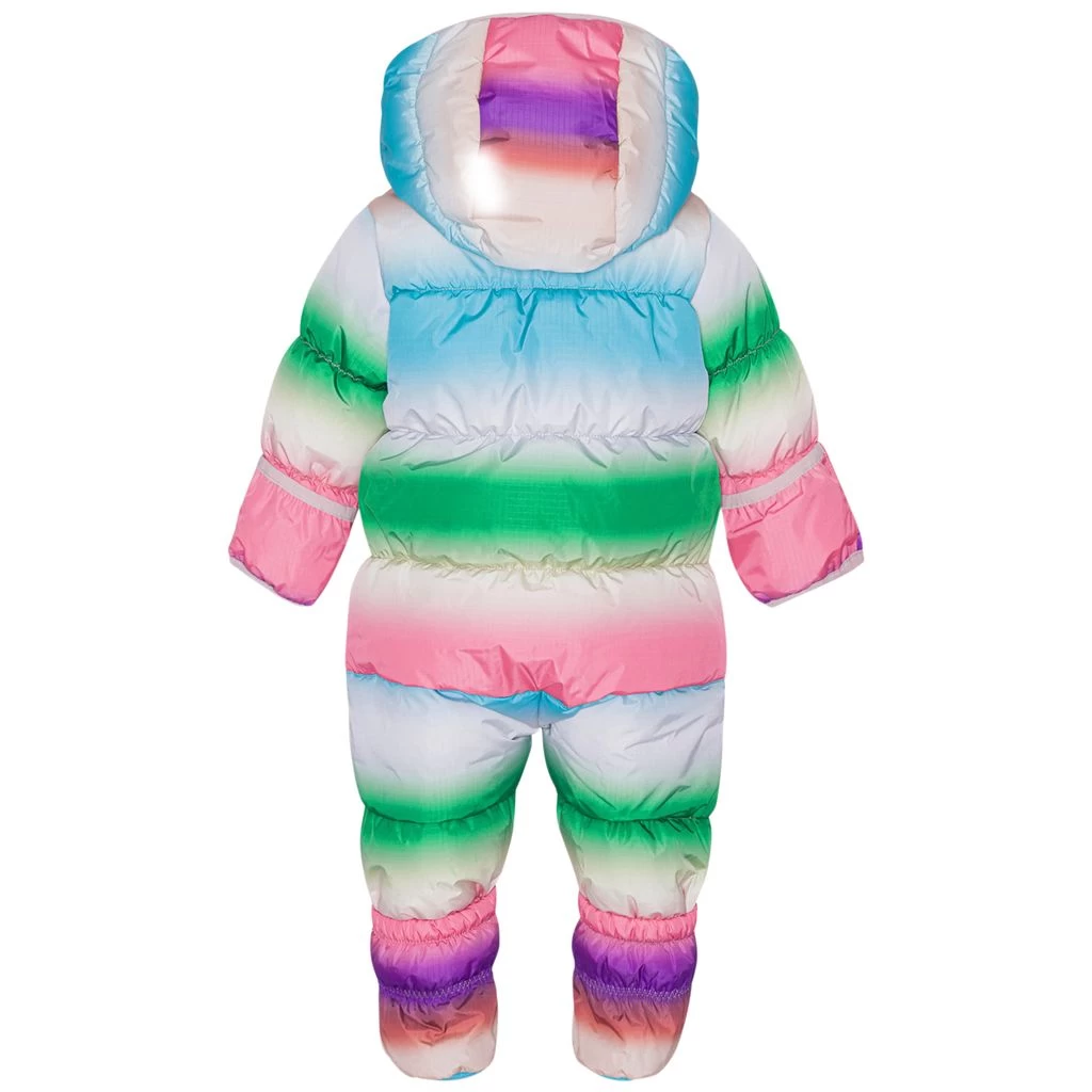 Prepare for winter in style and warmth with this amazing snowsuit. Multicolor Hebe snowsuit by Molo. The snowsuit has a soft fleece lining. It has a detachable hood, double zip closures at the front, fold-over cuffs and detachable winter booties.