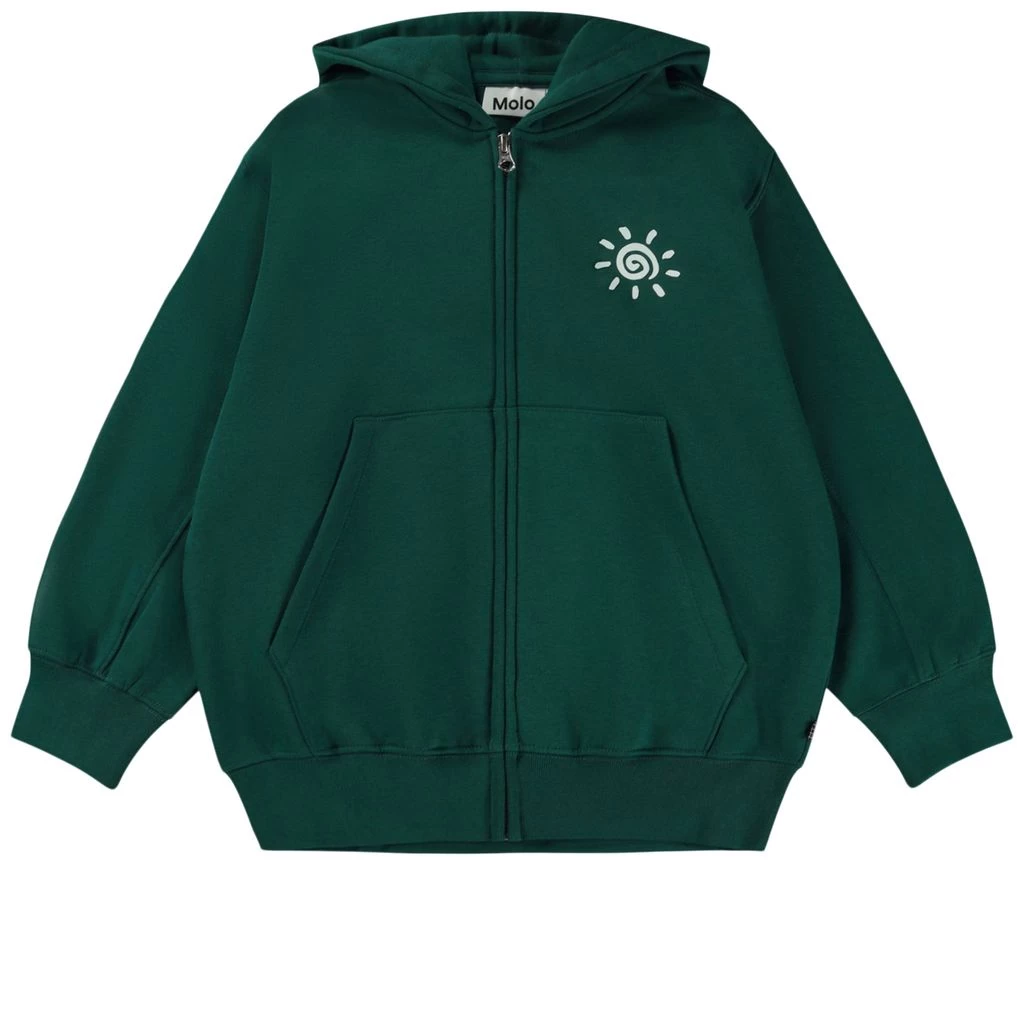 A super soft and comfy hoodie that’s just right for a laid back look. Green Mazz hoodie by Molo. The hoodie has a regular fit. It has a jersey-lined hood, a zip closure at the front, a split kangaroo pocket and ribbed cuffs.