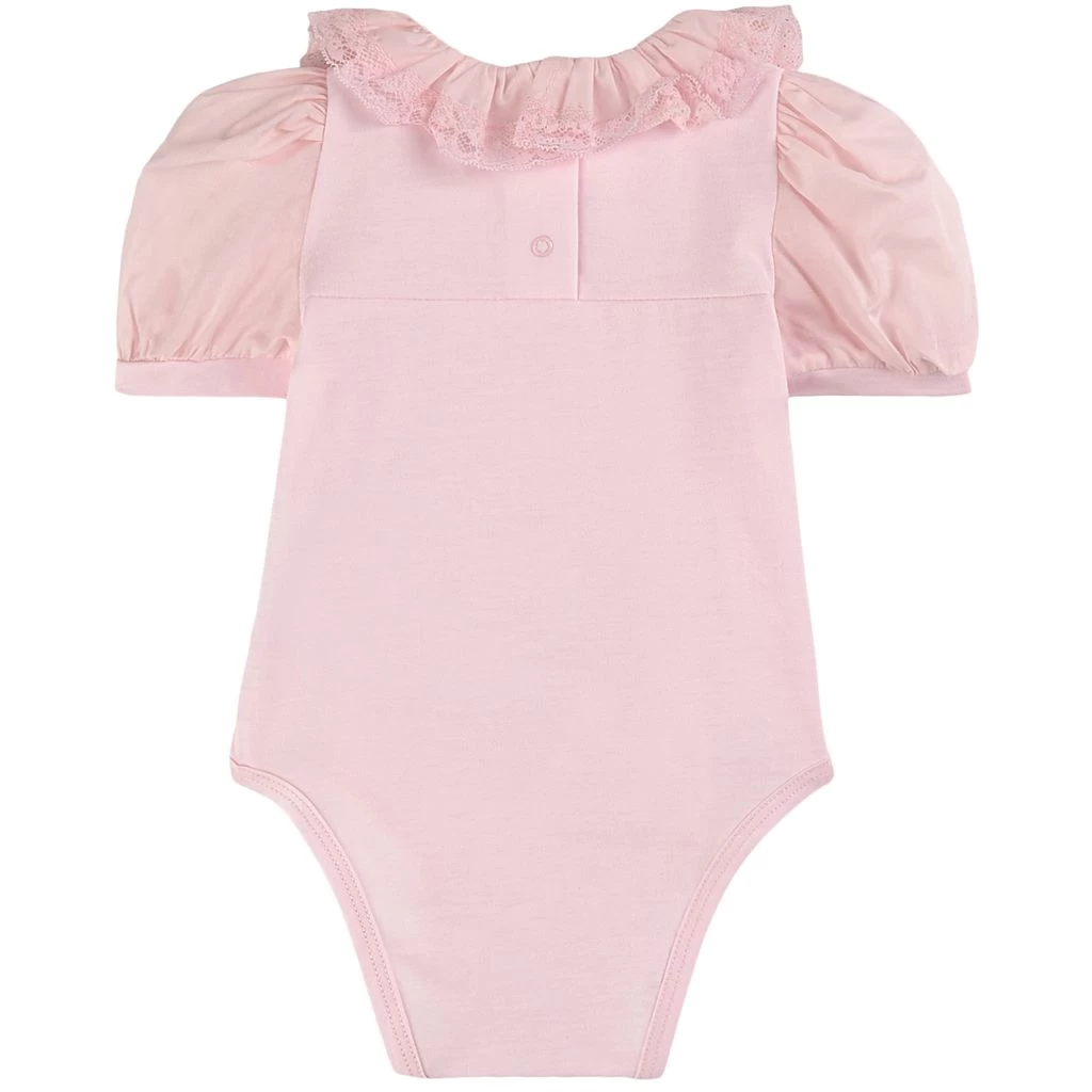 Pink Jersey baby body by Monnalisa. The baby body has a lace collar. It has snap buttons at the back and between the legs and puff sleeves.