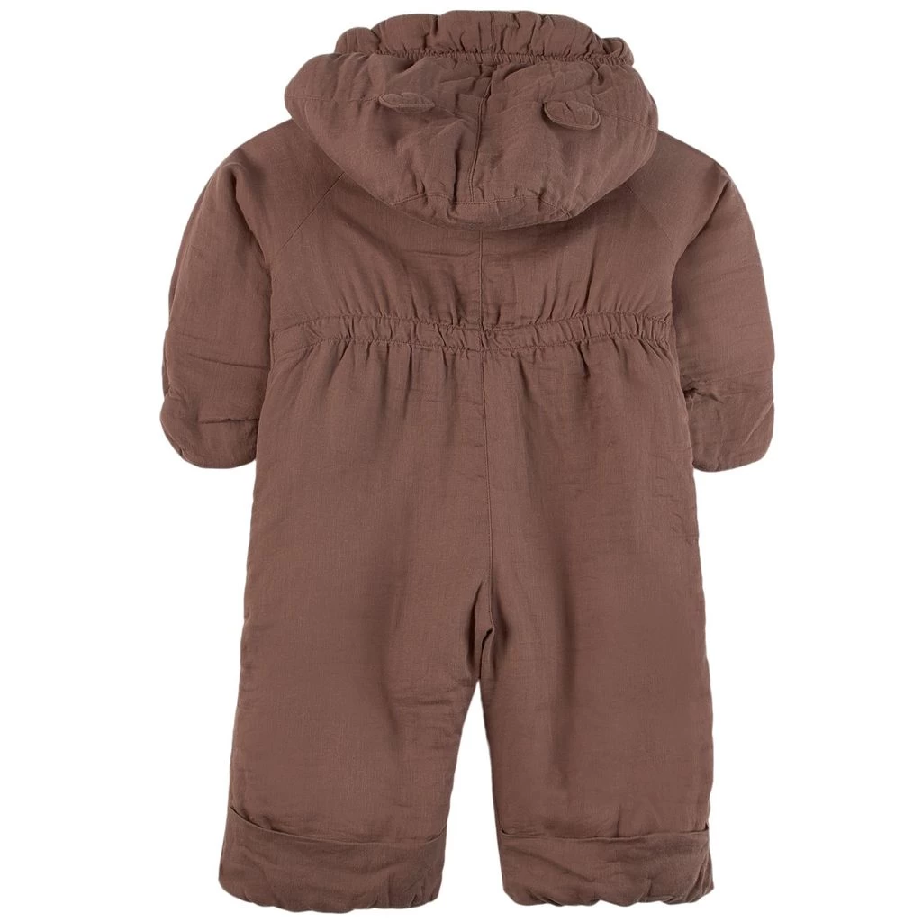 Muslin coverall by Buddy & Hope. The coverall has a double zip closure at the front. It has fold-over cuffs, a hood with animal ears, light padding and an elasticated waist at the back.