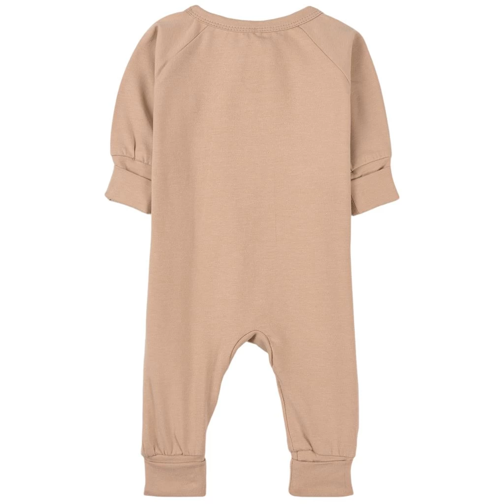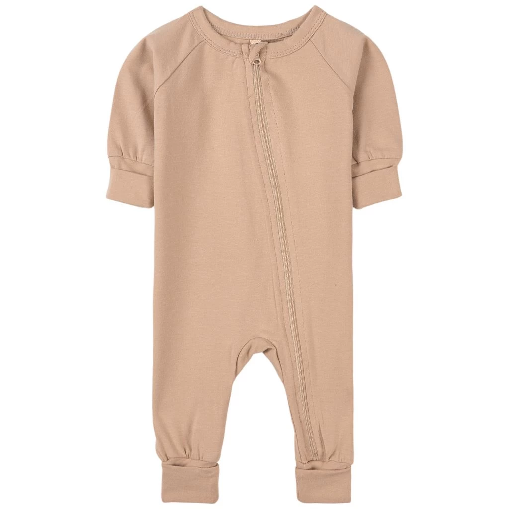 Sand one-piece by A Happy Brand. The one-piece has folded cuffs. It has a zip closure at the front.