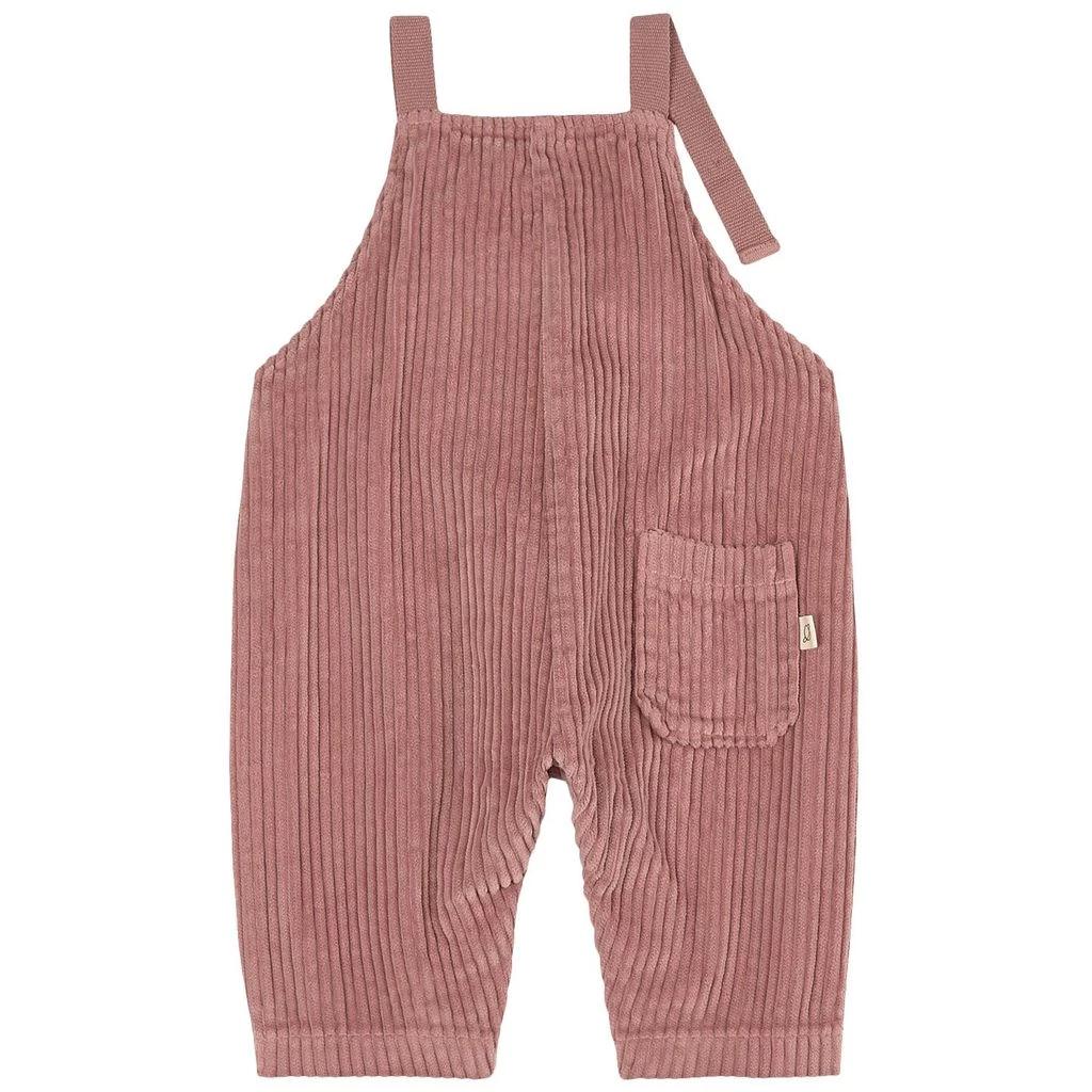 A cute and stylish look. Pink overalls by My Little Cozmo in corduroy. The overalls have a front pocket. They have a snap button closure between the legs and a back pocket.