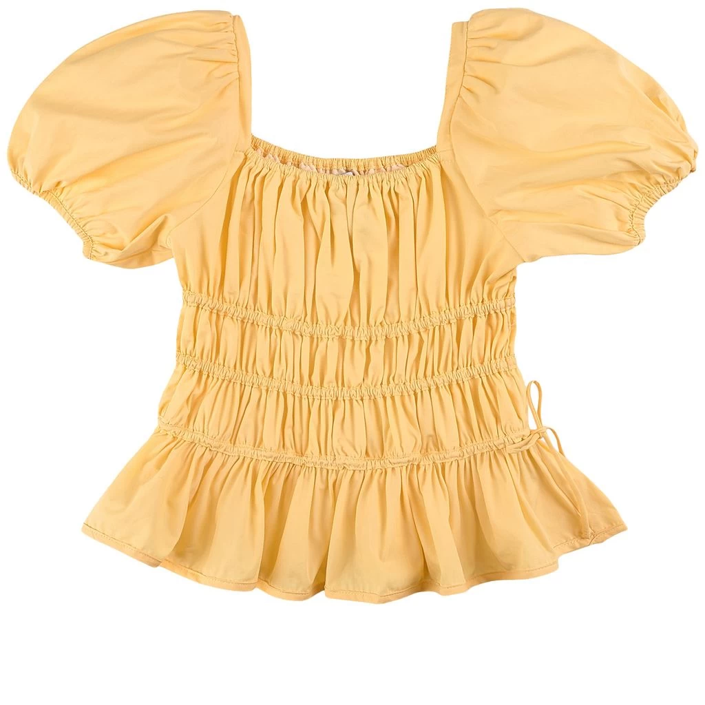 Dress up in sun-kissed colors. Yellow blouse by The Middle Daughter. The blouse has a u-neck. It has puff sleeves and a gathered design with elastic bands.