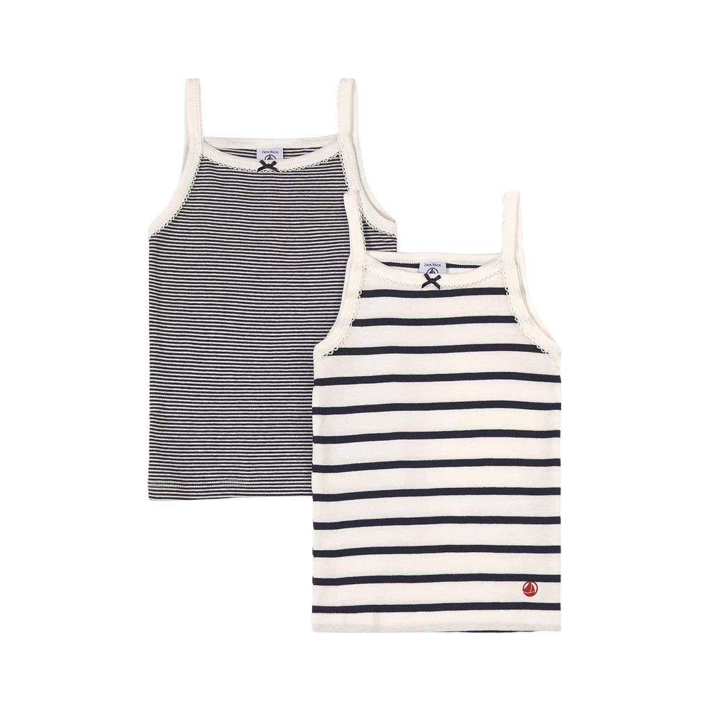 Cream tank tops by Petit Bateau. The tops have spaghetti straps. They have a picot trim.