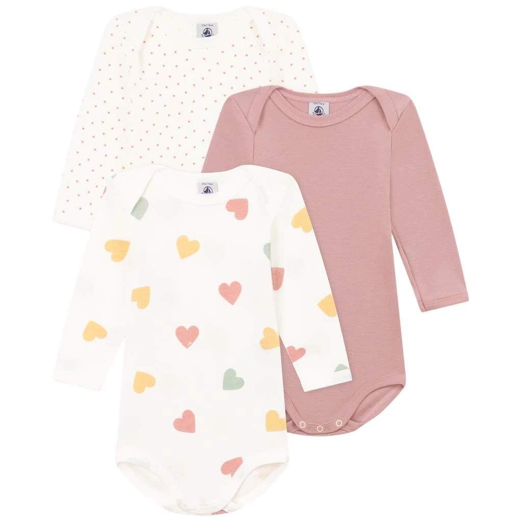 Stock up on baby basics. Cream, pink baby bodies by Petit Bateau. The baby bodies have an envelope folded neckline. They have snap buttons between the legs and a heart print.