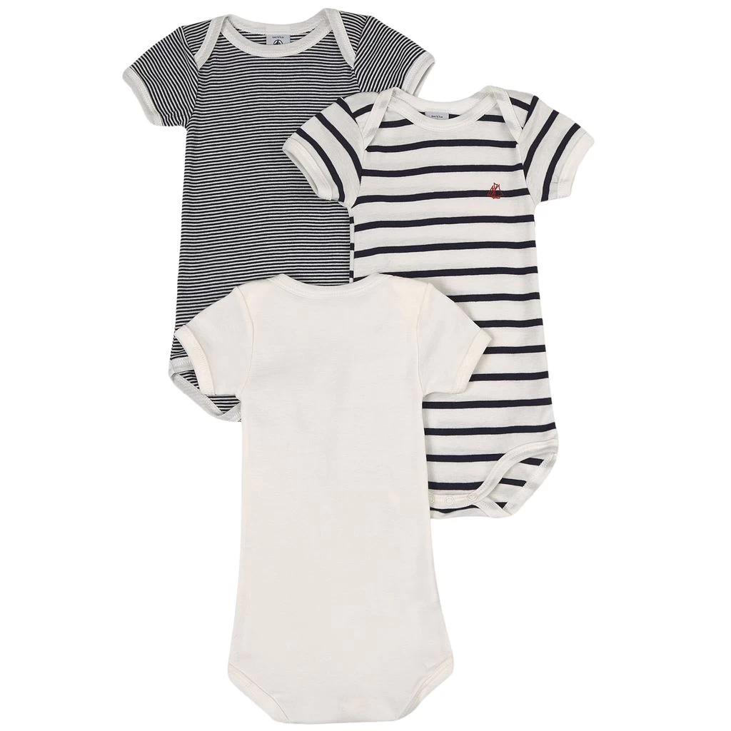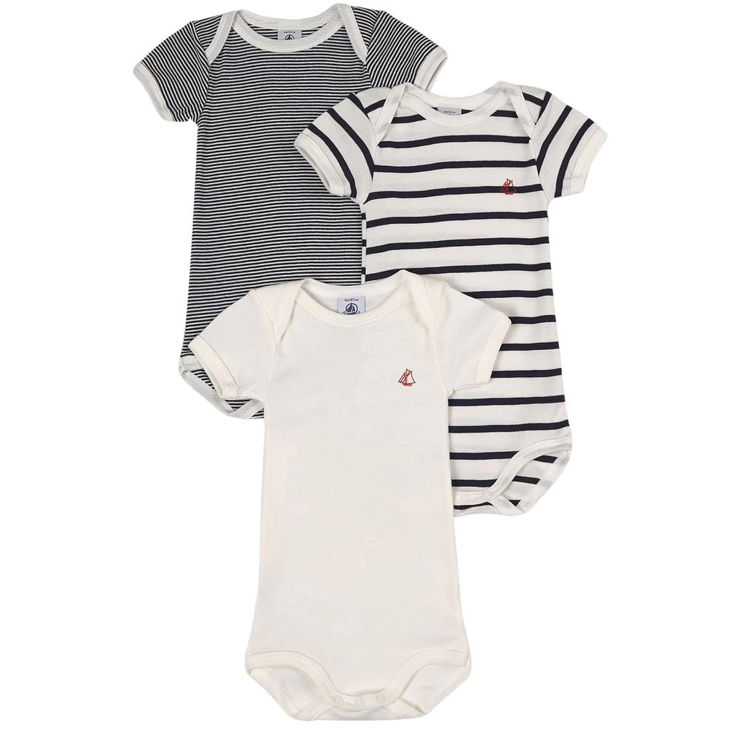 Stock up on baby basics. Navy baby bodies by Petit Bateau. The baby bodies have an envelope folded neckline. They have snap buttons between the legs.