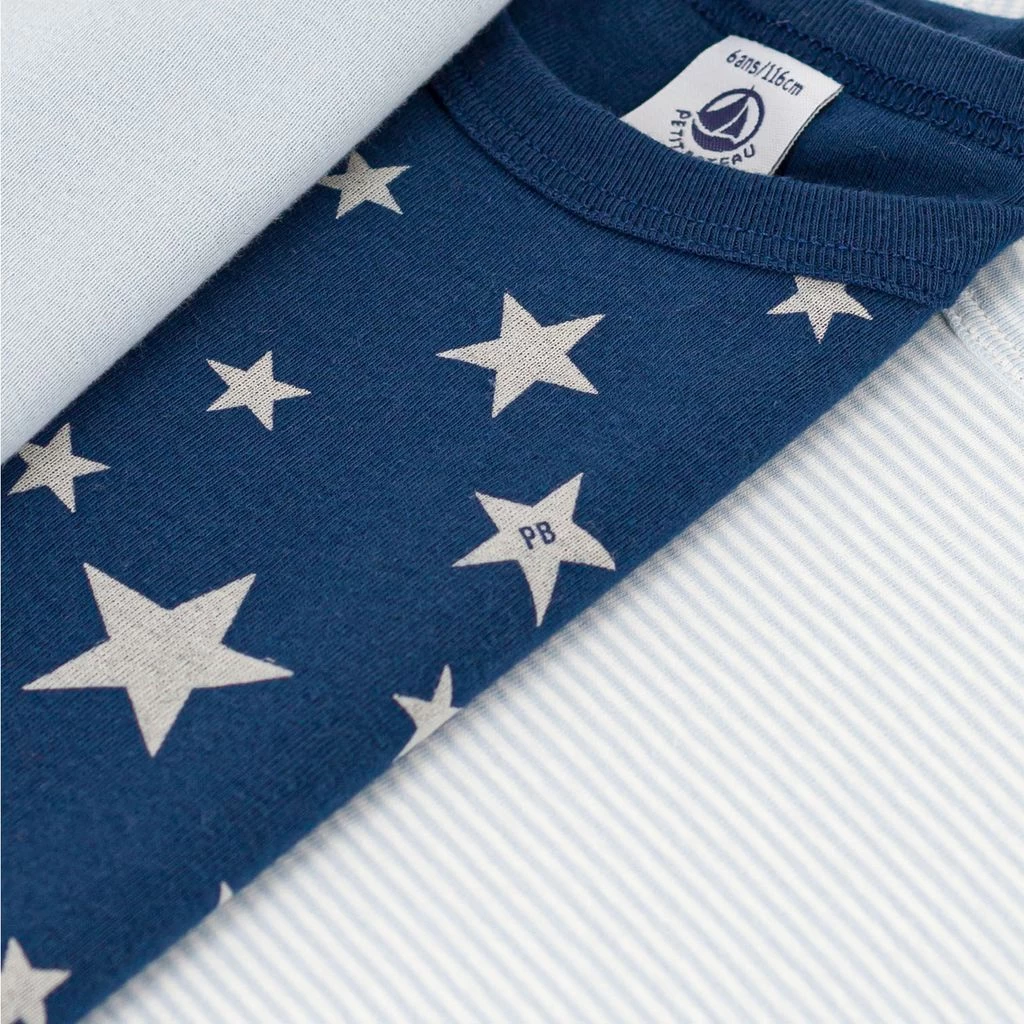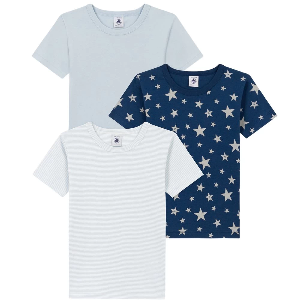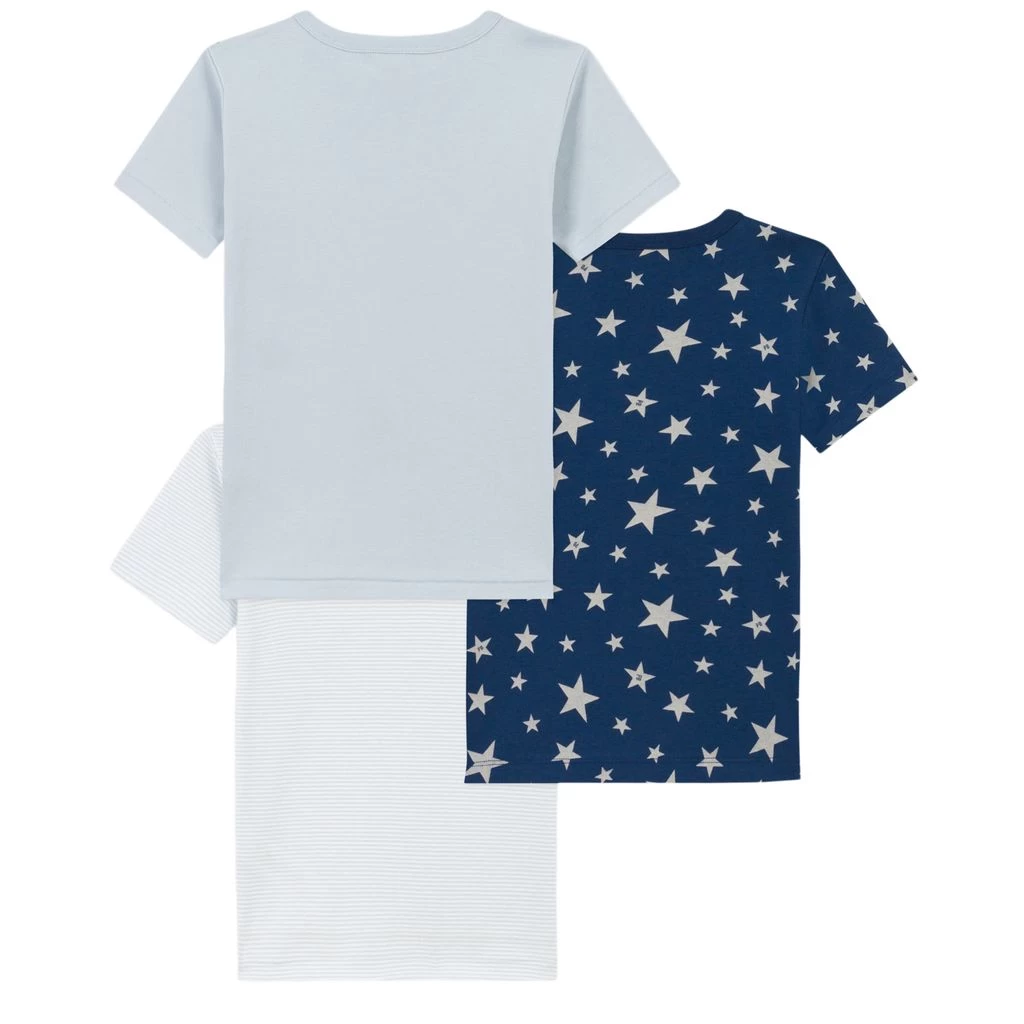 Stock up on basics. Blue T-Shirts by Petit Bateau. The T-Shirts have a regular fit. They have a glow-in-the-dark star print.