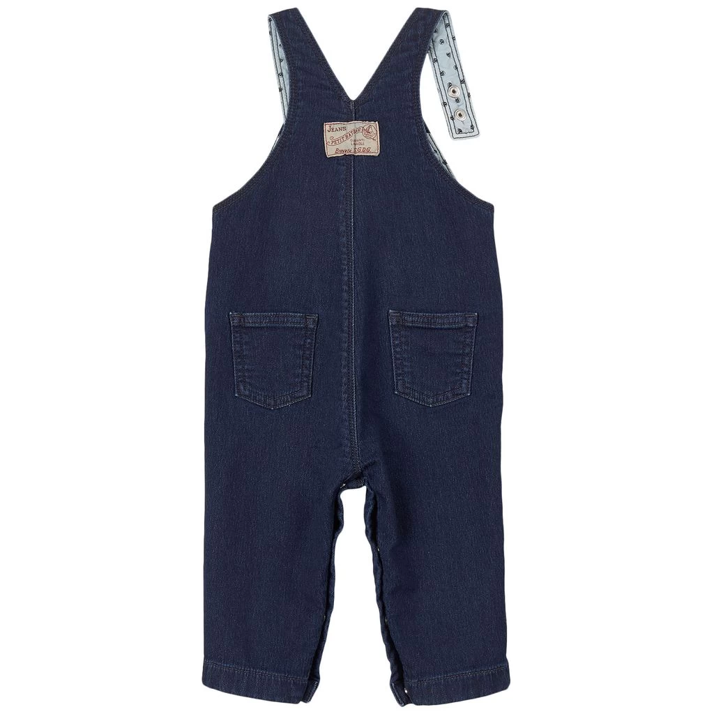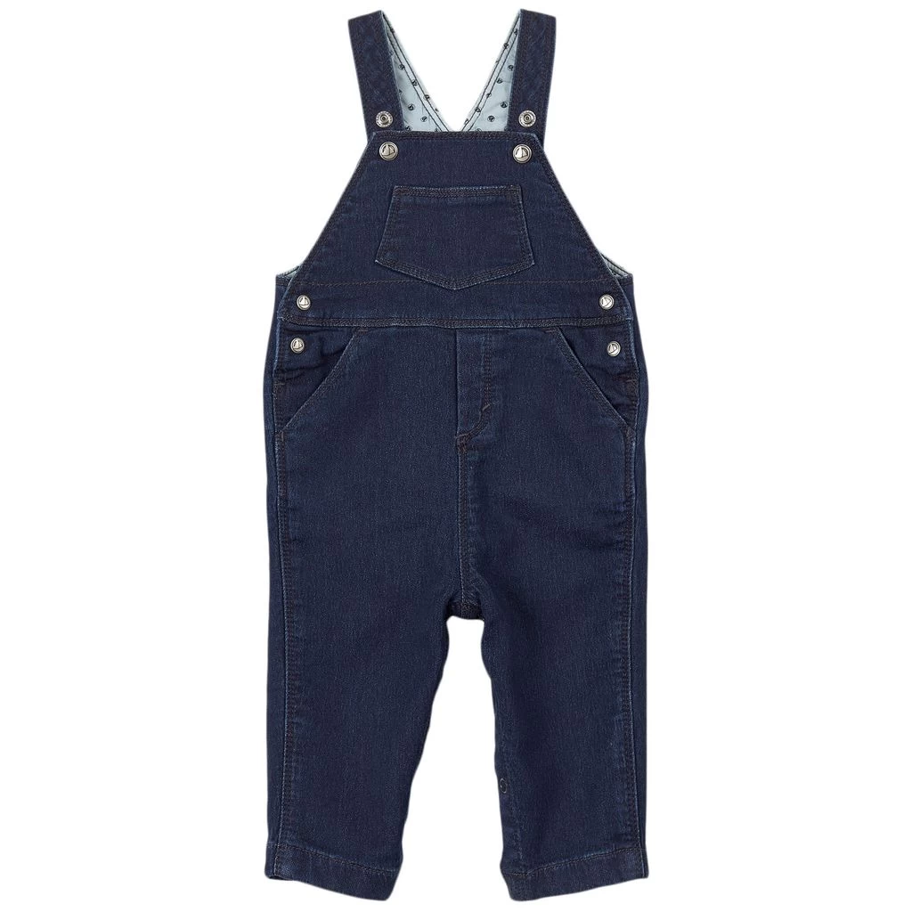 Dark Blue Baby Denim overalls by Petit Bateau. The overalls have adjustable shoulder straps. They have snap buttons on the sides and between the legs, three front pockets and two back pockets.