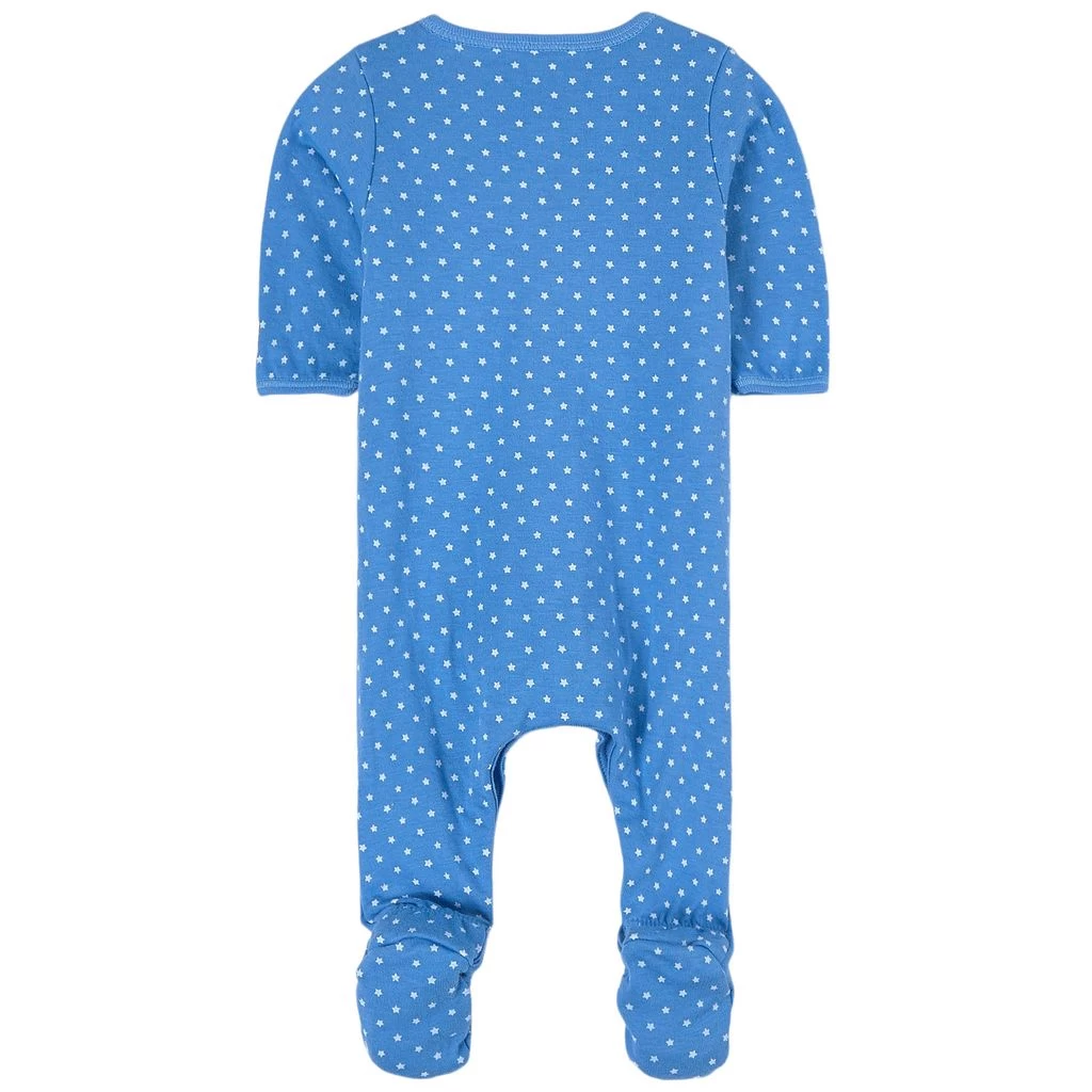 Blue baby grow by Petit Bateau. The baby grow has snap buttons at the front and between the legs.
