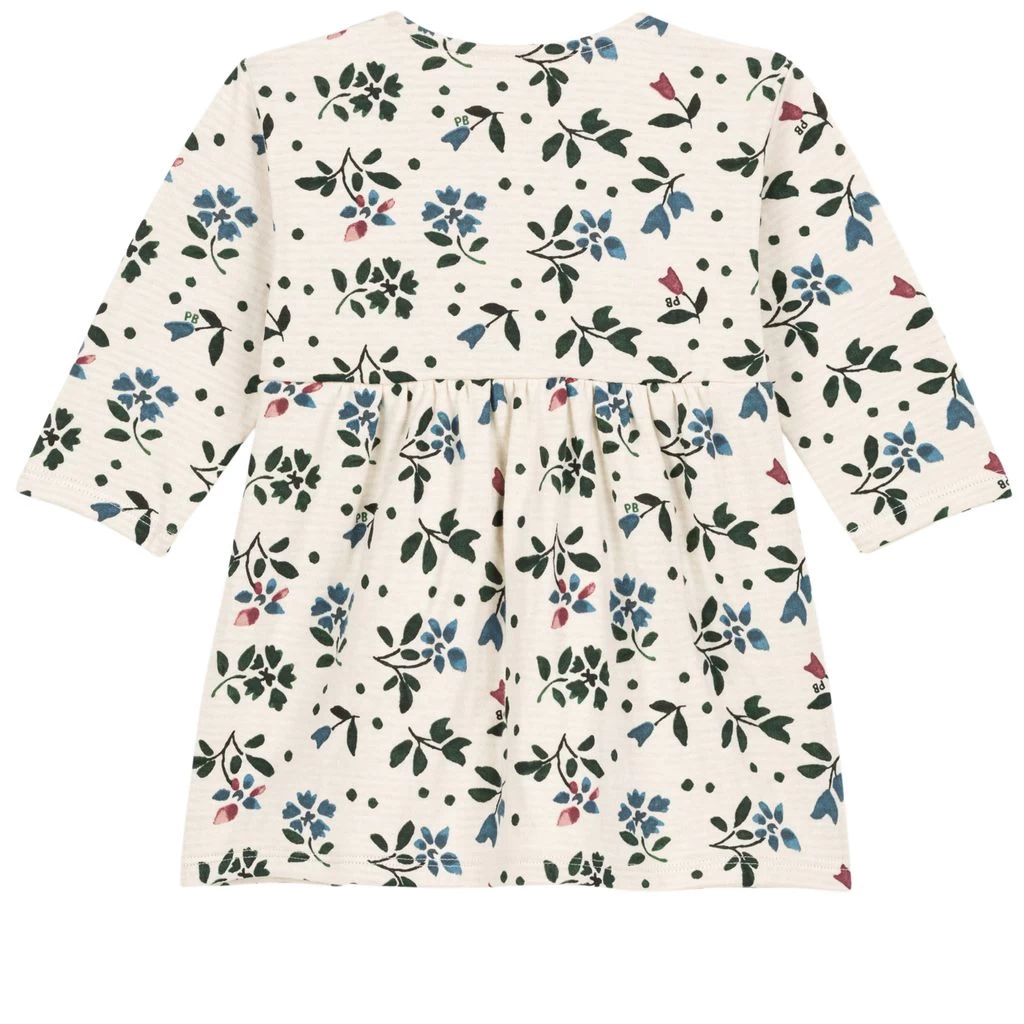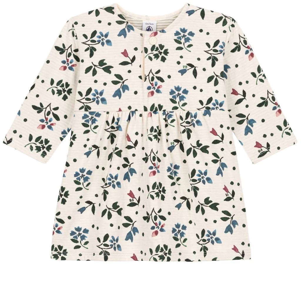Dress your little baby extra nicely. Cream baby dress by Petit Bateau. The baby dress has a floral all-over print. It has a button closure at the front and a gathered waist.