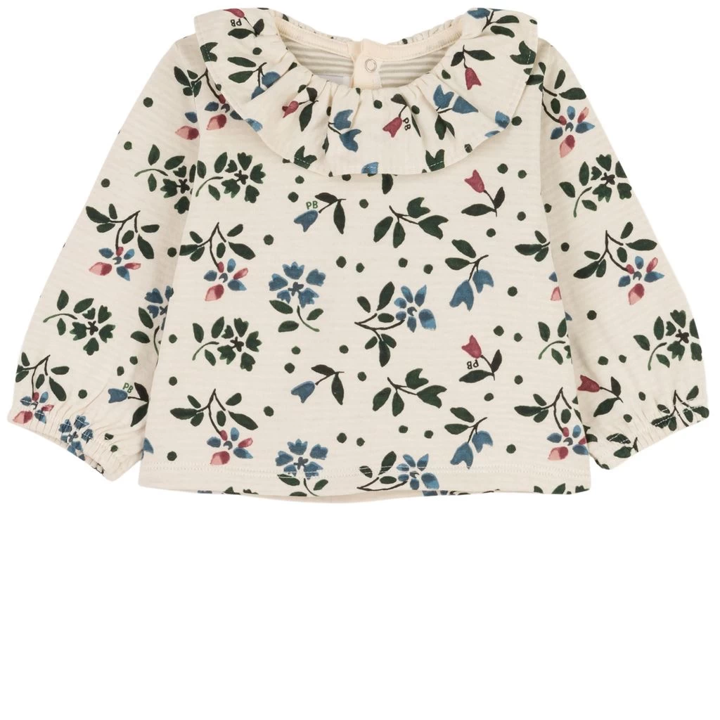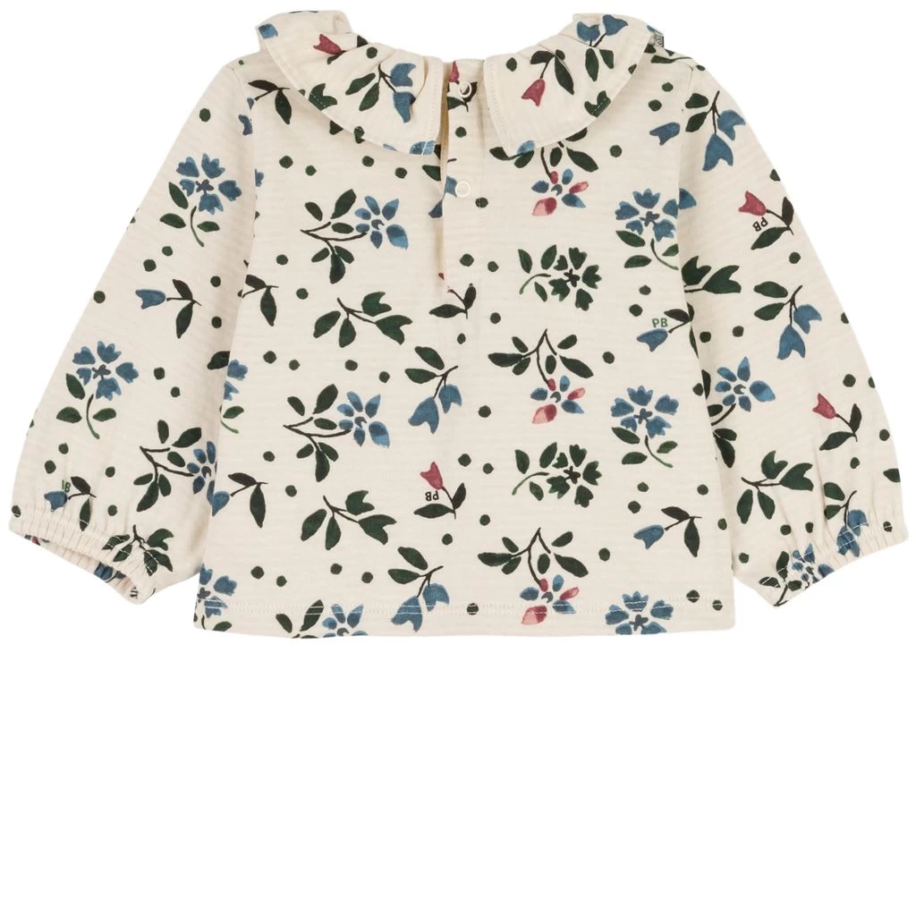 This blouse makes any look more flattering. Cream blouse by Petit Bateau. The blouse has a floral all-over print. It has a cute ruffle collar and a snap button closure at the back for easy dressing.