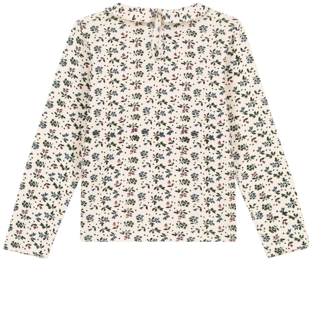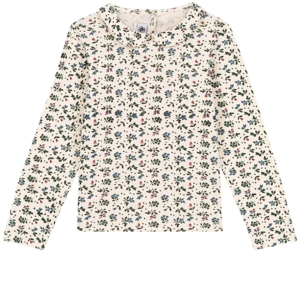 Pull out your garden vibes with this stylish T-shirt!. Cream T-shirt by Petit Bateau. The T-shirt has a floral all-over print. It has a Peter Pan collar and a snap button closure at the back.