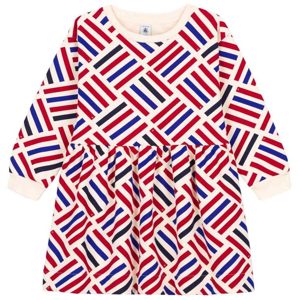 A dress for every occasion. Beige dress by Petit Bateau in fleece. The dress has a printed pattern all over. It has a loose fit and a tailored fit at the waist.