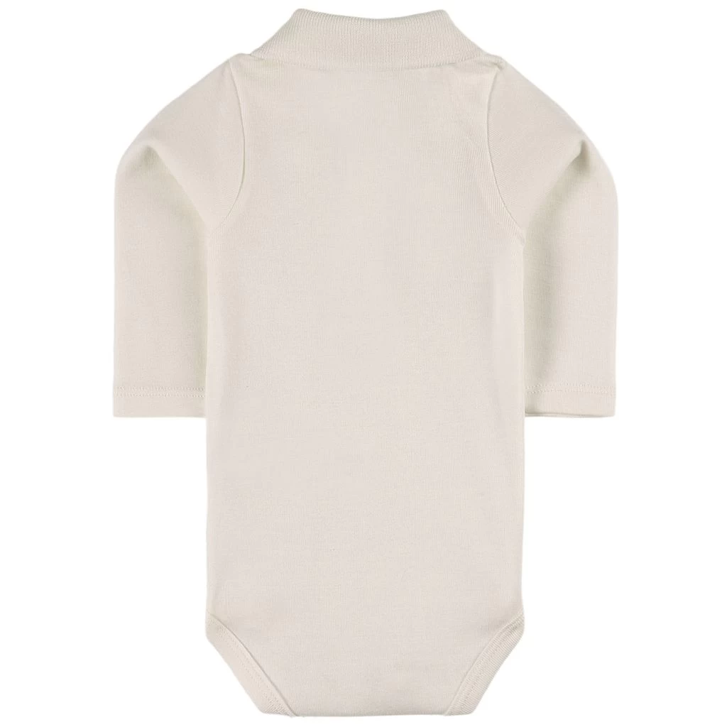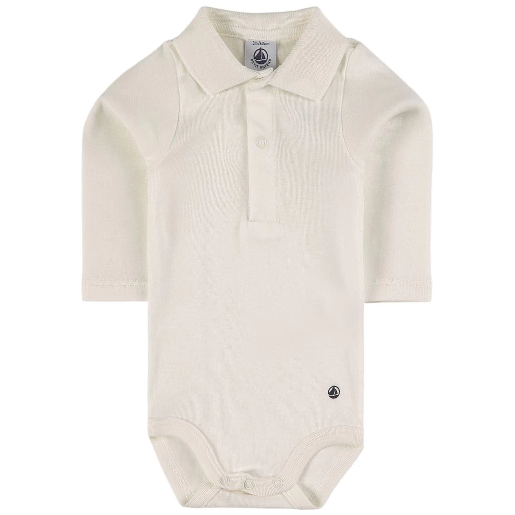 White Polo baby body by Petit Bateau. The baby body has a ribbed collar. It has a button closure at the front and a snap button closure between the legs.