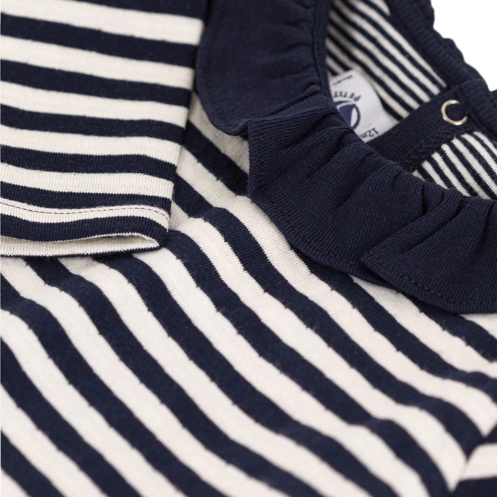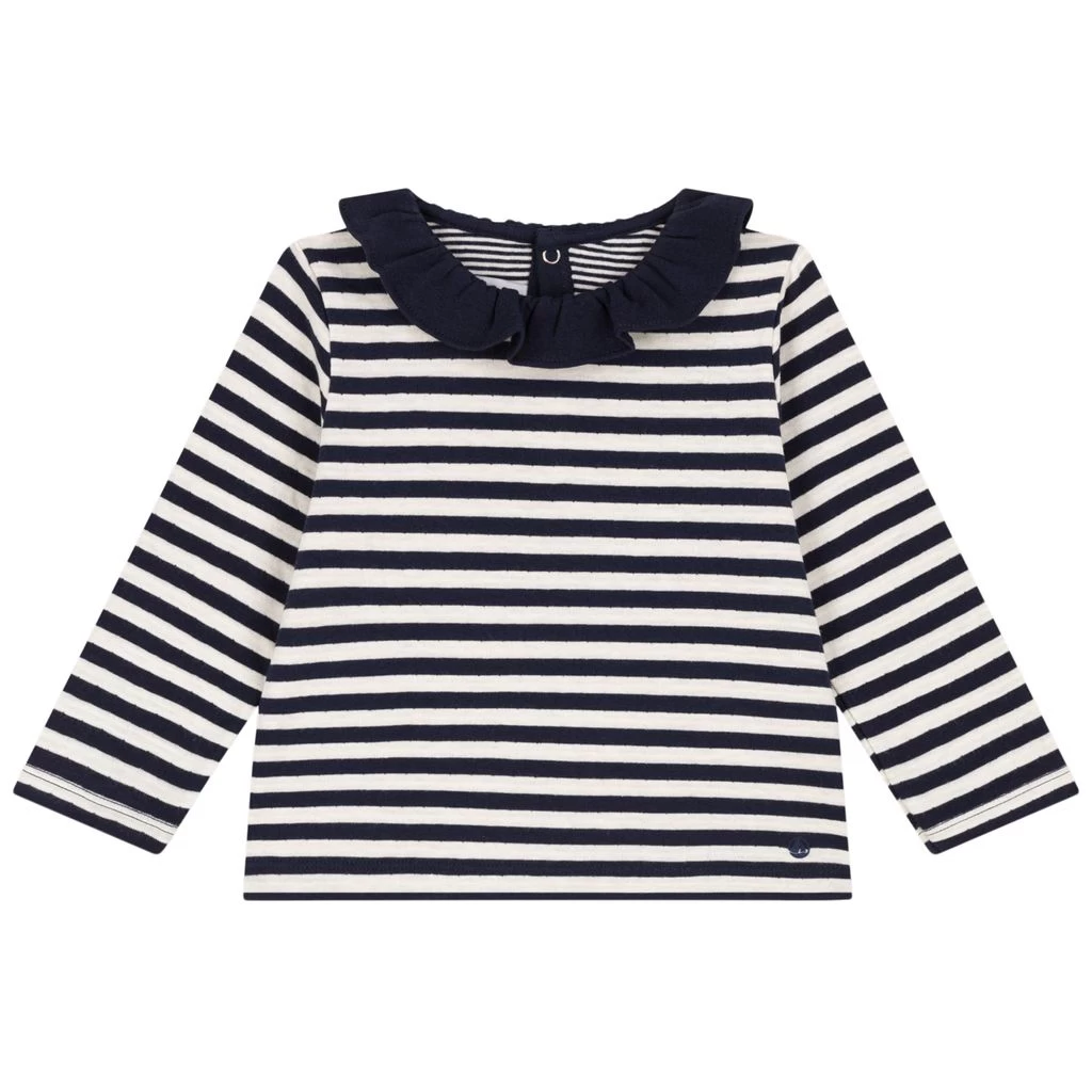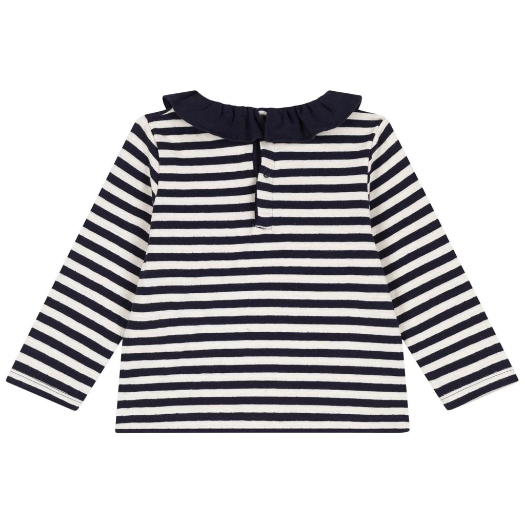 Your little one can play all day in comfort. Long sleeved, navy T-Shirt by Petit Bateau. The T-Shirt has a striped all-over print. It has a regular fit, a ruffle collar and snap buttons at the back.