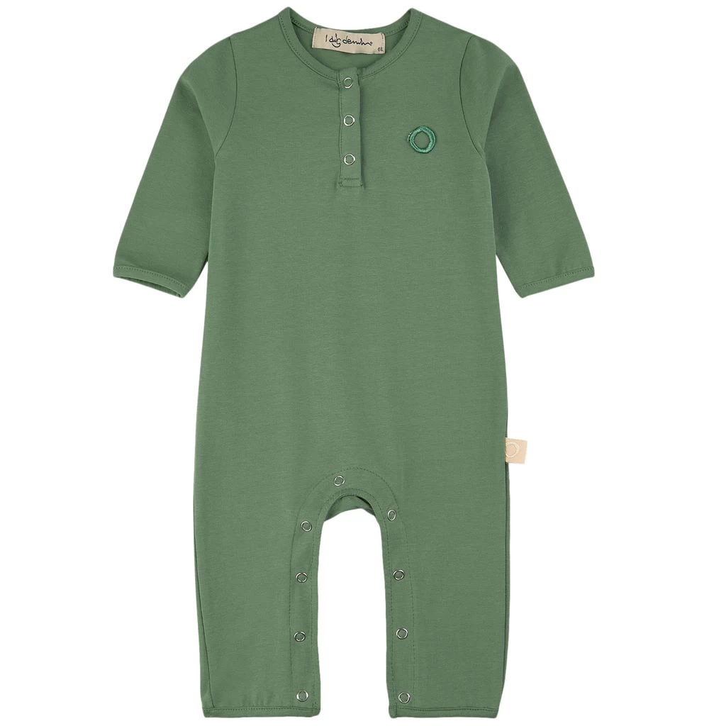 Organic cotton keeps you cozy and comfortable all day. Green Plano one-piece by I Dig Denim. The one-piece has snap buttons at the front and between the legs.