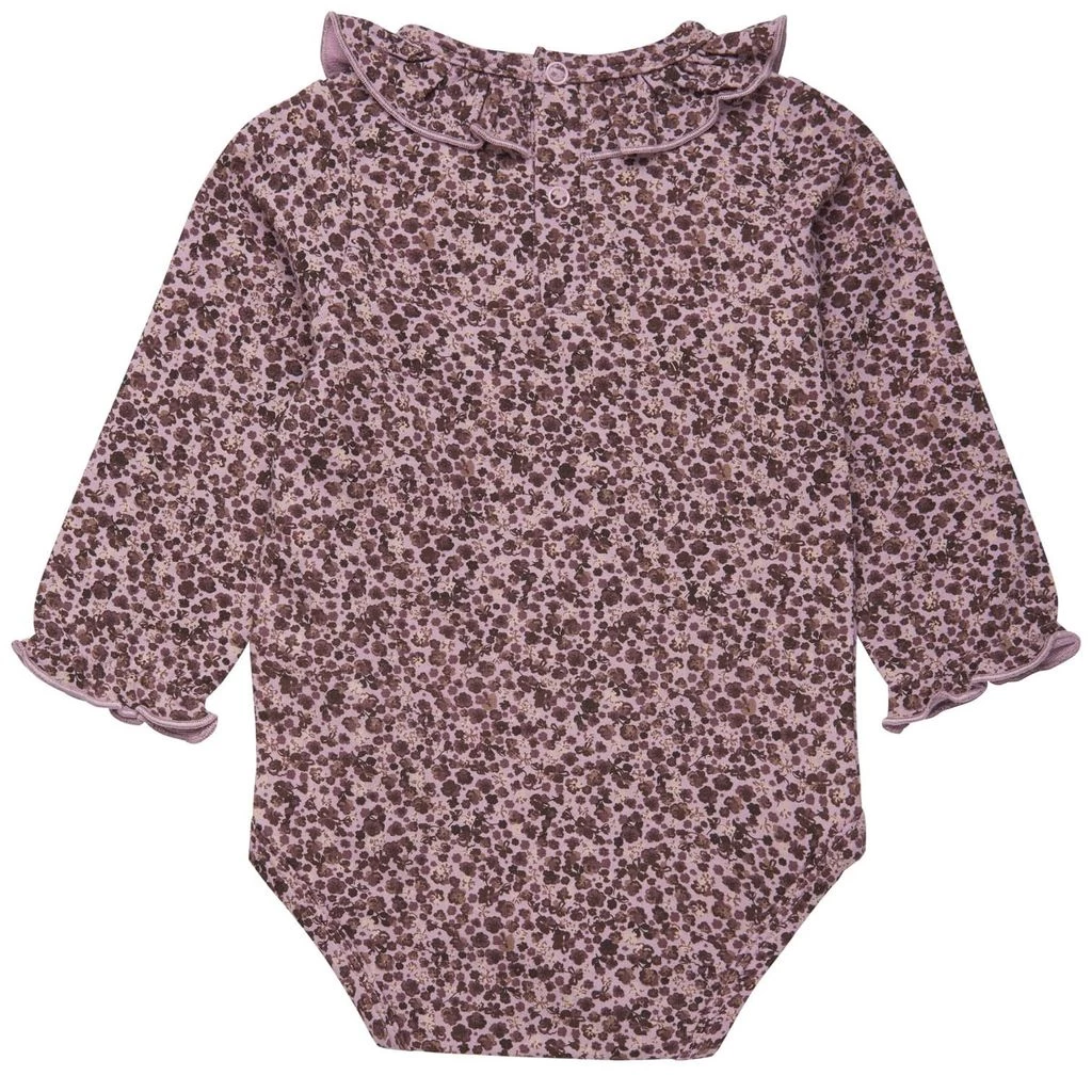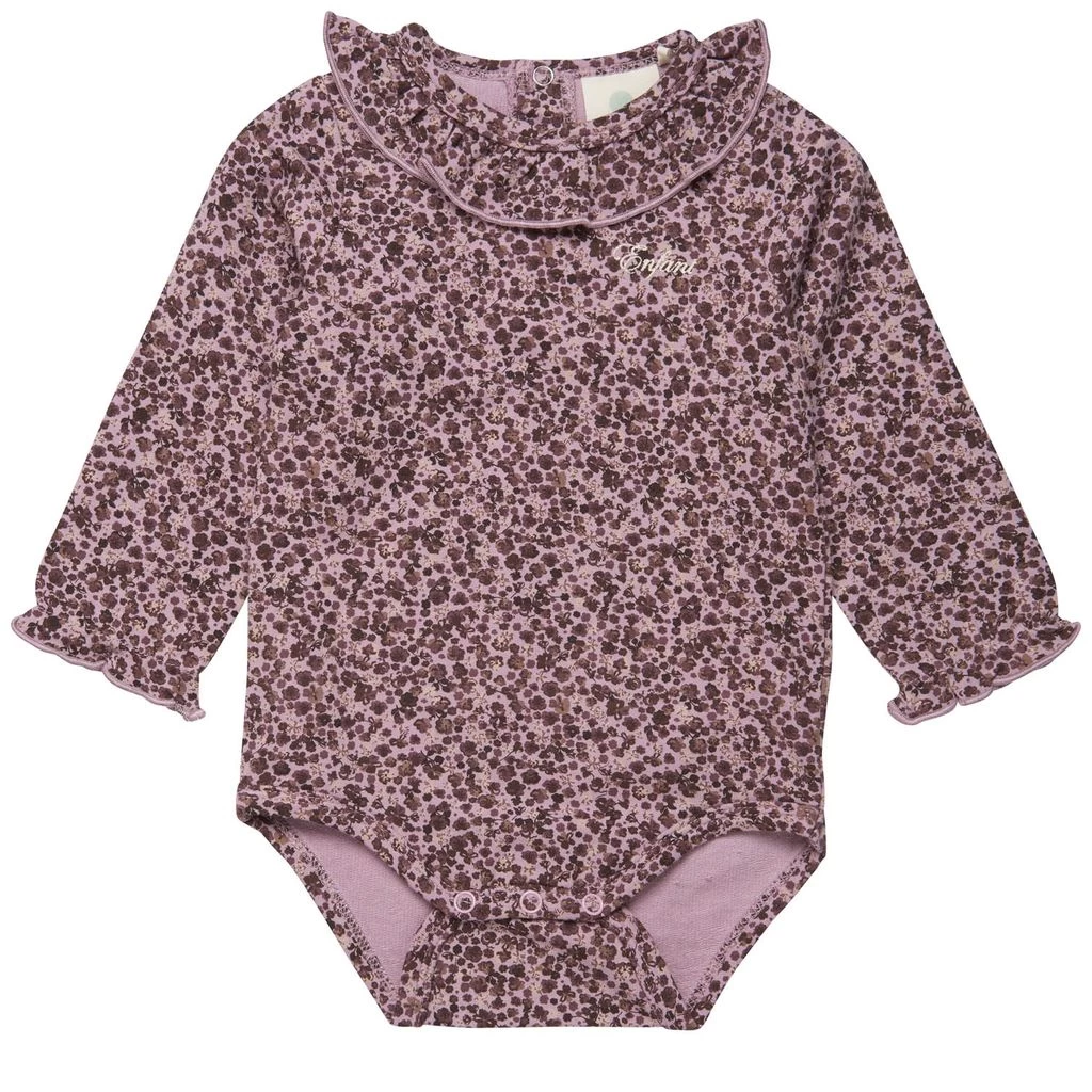 The baby body is not only stylish, but also perfect for practical use. Purple baby body by EnFant. The baby body has an all-over print. It has a ruffle collar, ruffled sleeves, a snap button closure between the legs and at the back and a brand name on the chest.