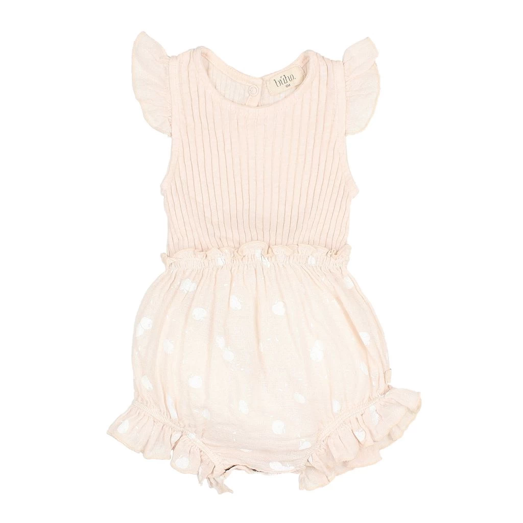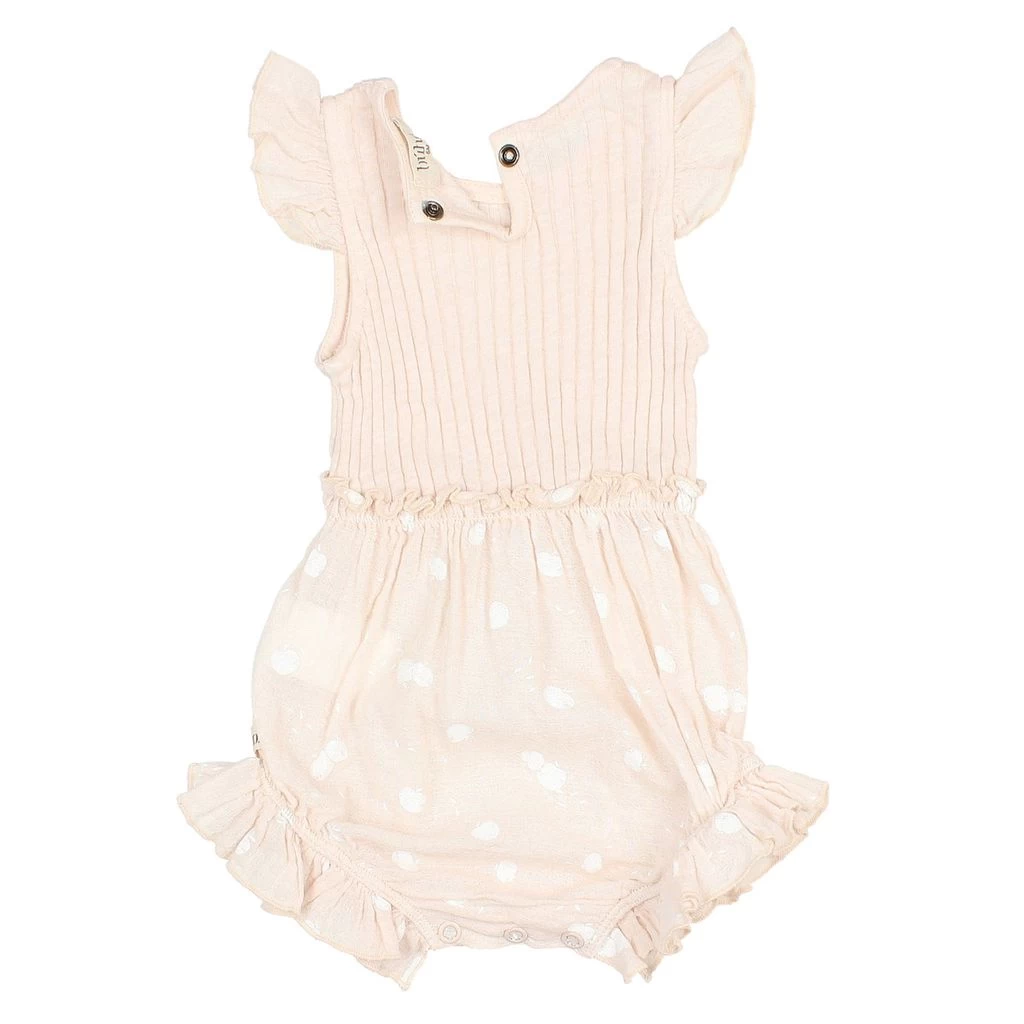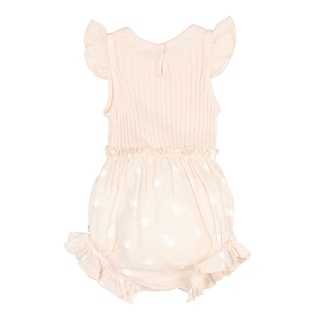 Style and comfort are in this romper. Pink romper by búho. The romper has ruffle details. It has a ribbed bodice with button, an elasticated waist and snap buttons at the back and between the legs.