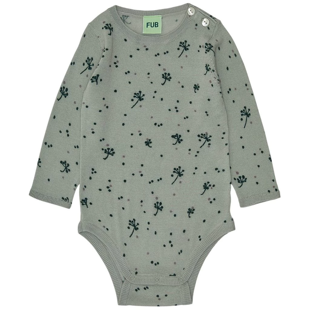 This wool baby body is a stylish first choice for cold days. Green wool baby body by FUB. The wool baby body has an all-over print. It has a button closure at the shoulder and a snap button closure between the legs.