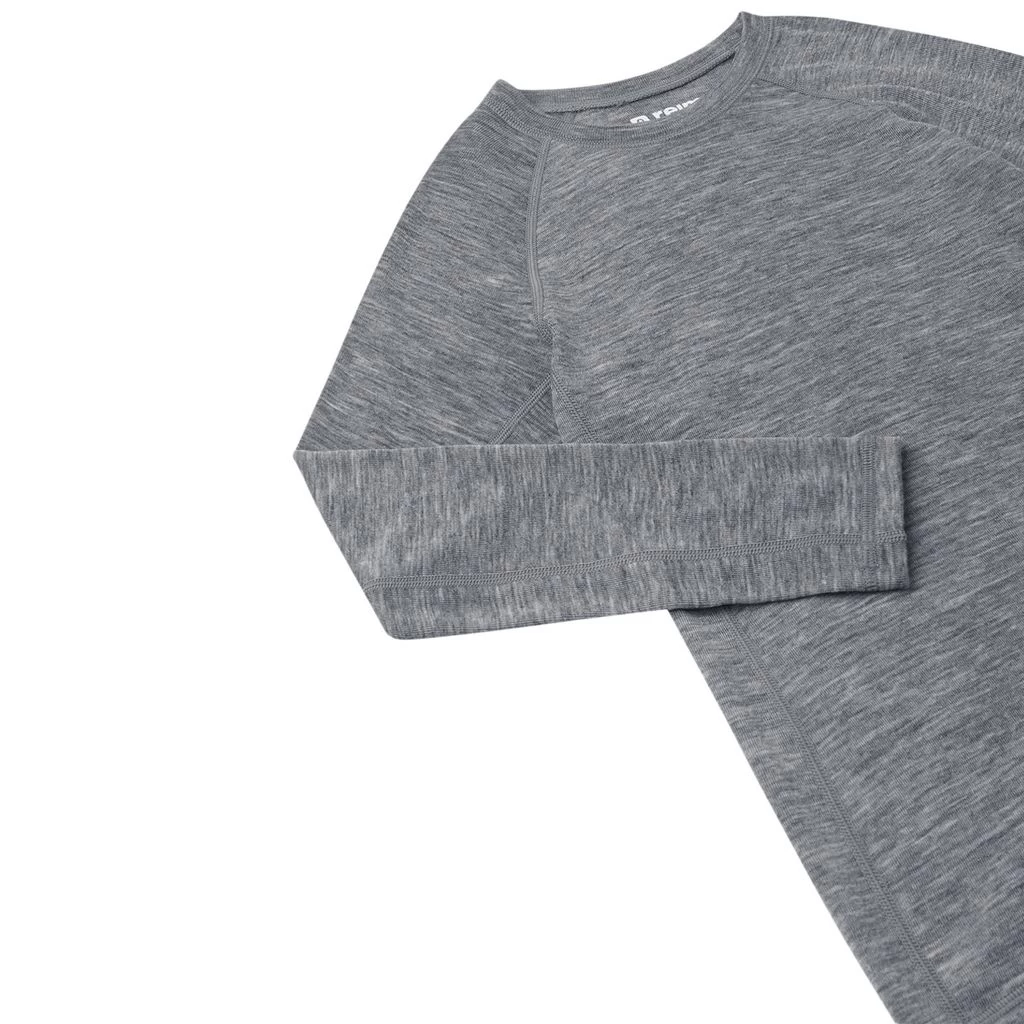Get ready for outdoor adventures. Grey Melange Kinsei baselayer set by Reima in wool. The baselayer set has soft, flat seams for comfort. It has an elasticated waist and a longer back hem.