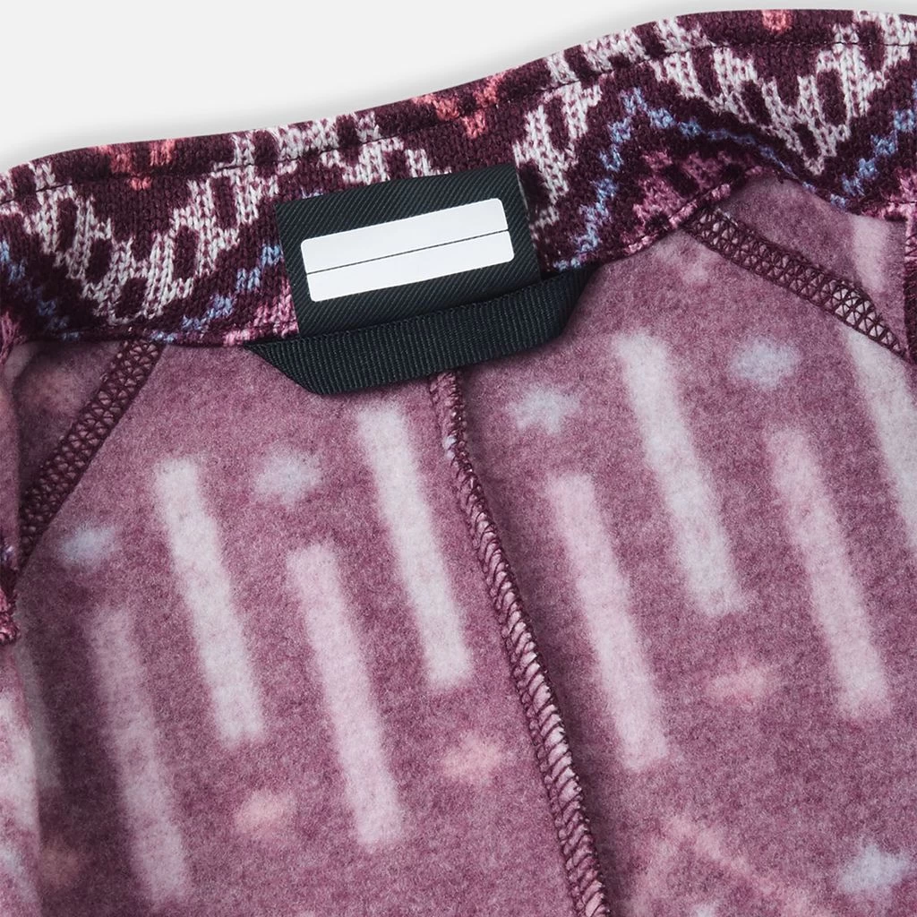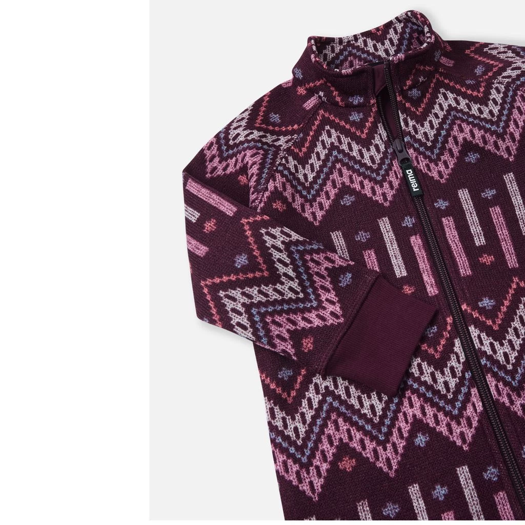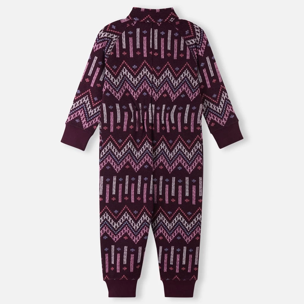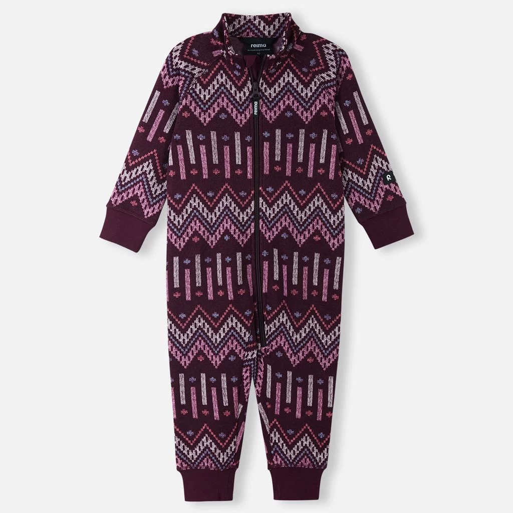 Keep warm with comfy fleece. Purple Myytti onesie by Reima. The onesie has a zip closure at the front. It has ribbed cuffs.