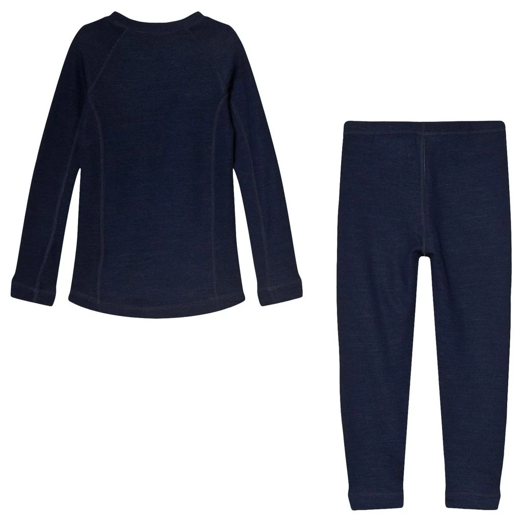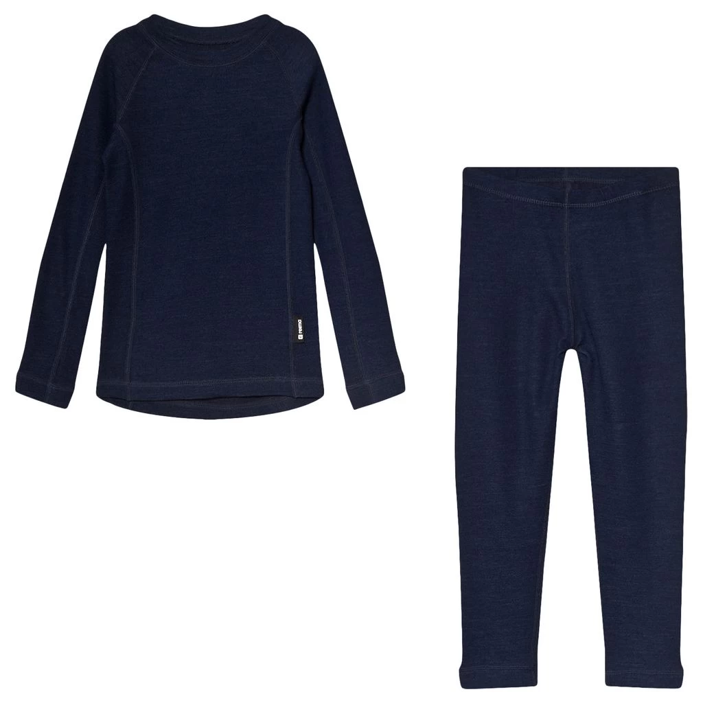 Navy Taitoa baselayer set by Reima. The baselayer set has soft flat seams to prevent chafing. It has a top with a longer hem at the back and trousers with an elasticated waist.