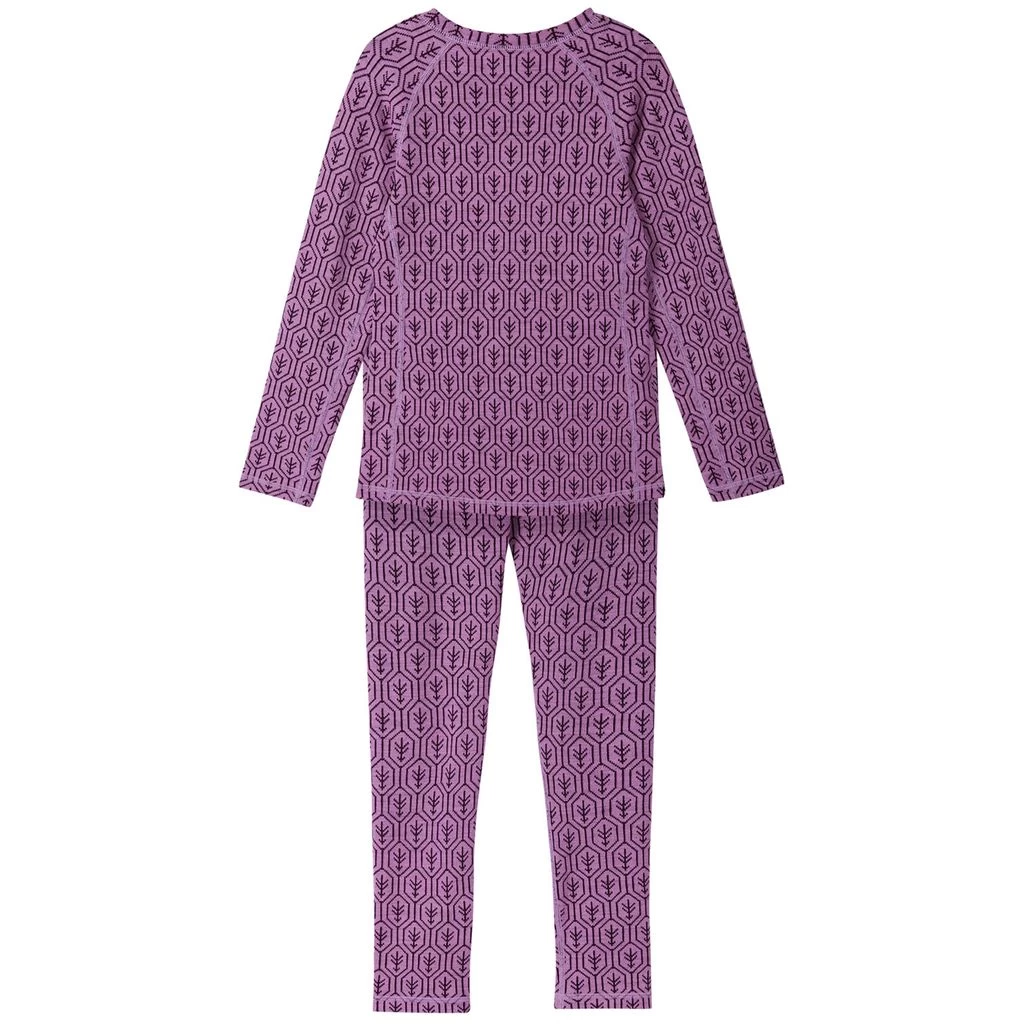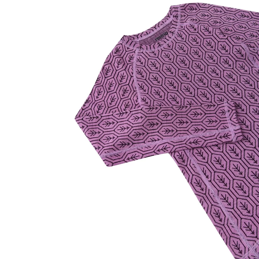 Feel warm and stylish!. Pink Taival baselayer set by Reima. The baselayer set has an all-over print. It has non-chafing, flat-stitched seams and pants with an elasticated waist.