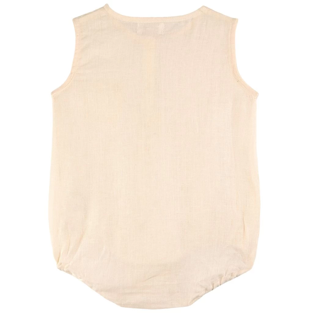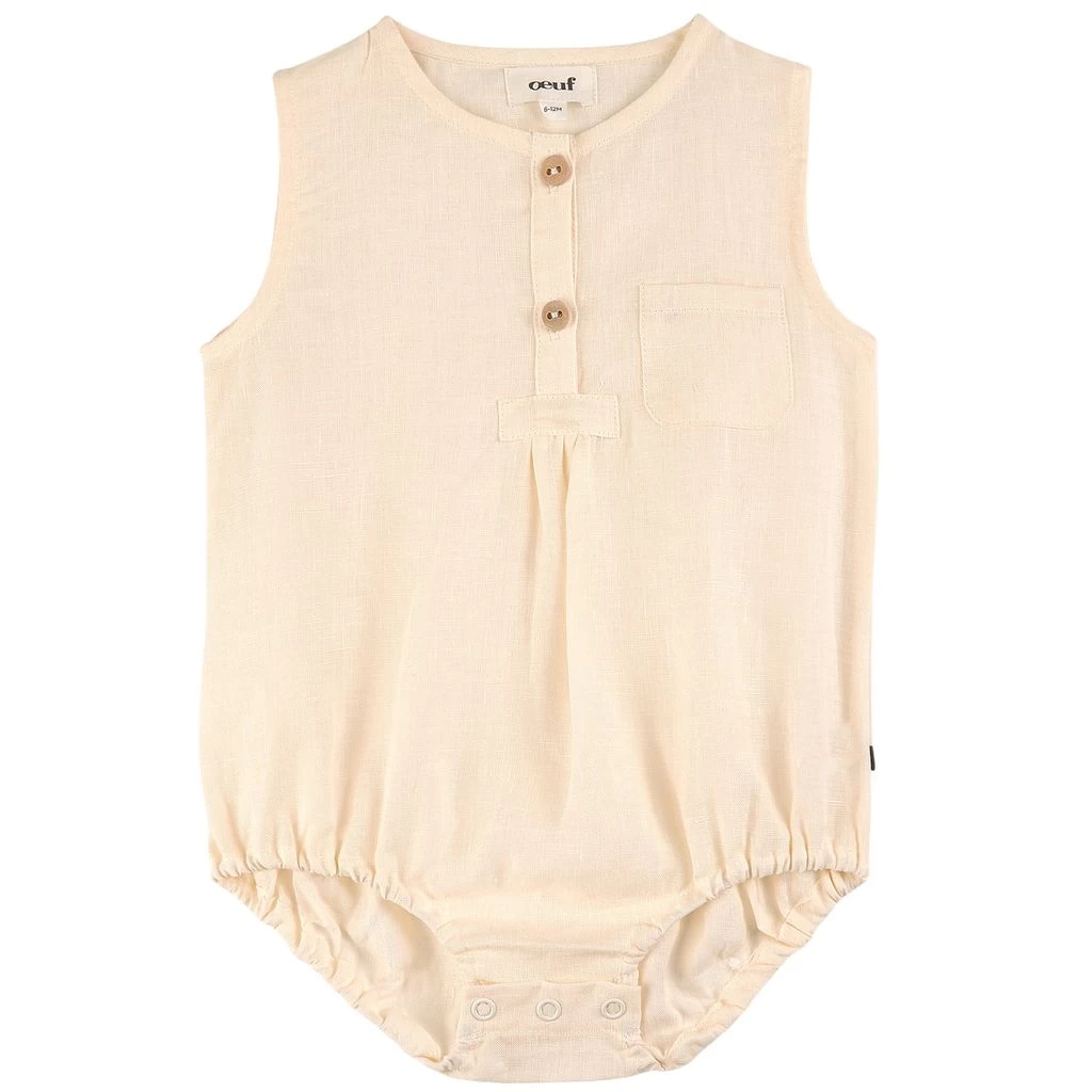 All-round comfort for all day fun. Off-white romper by Oeuf. The romper has a button closure at the front and at the front. It has a chest pocket, a snap button closure between the legs and elasticated leg openings.