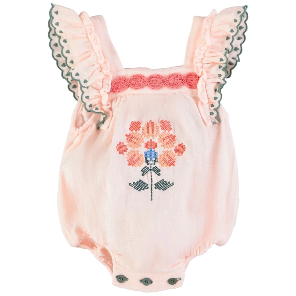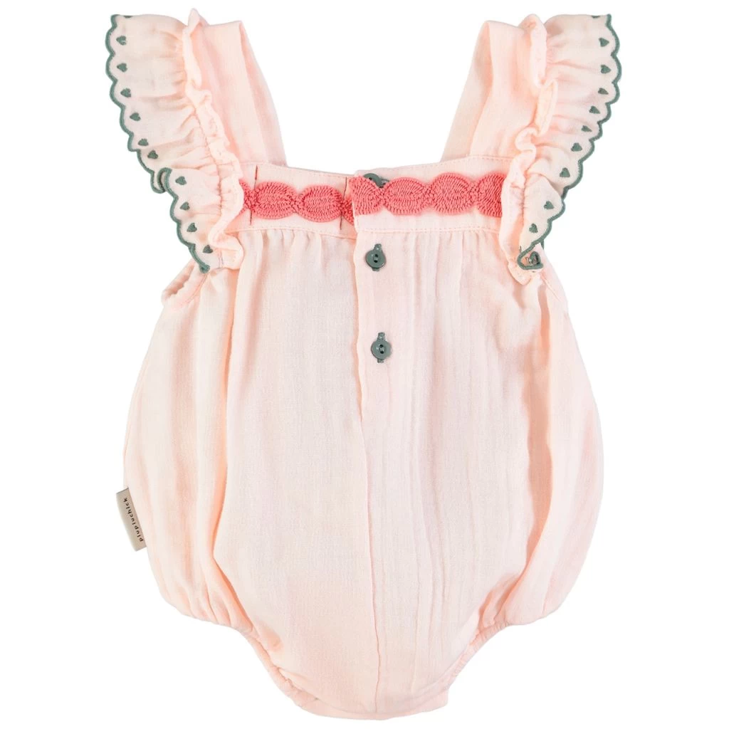 Add a pop of color to your day. Have fun on those adventures with this romper!. Pink romper by Piupiuchick. The romper is made in Portugal and has a button closure at the back. It has a ruffle detail on the sleeves.