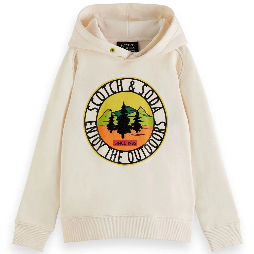 A super soft and comfy hoodie that’s just right for a laid back look. Cream graphic hoodie by Scotch & Soda. The graphic hoodie has big branding on the front. It has ribbed trims.