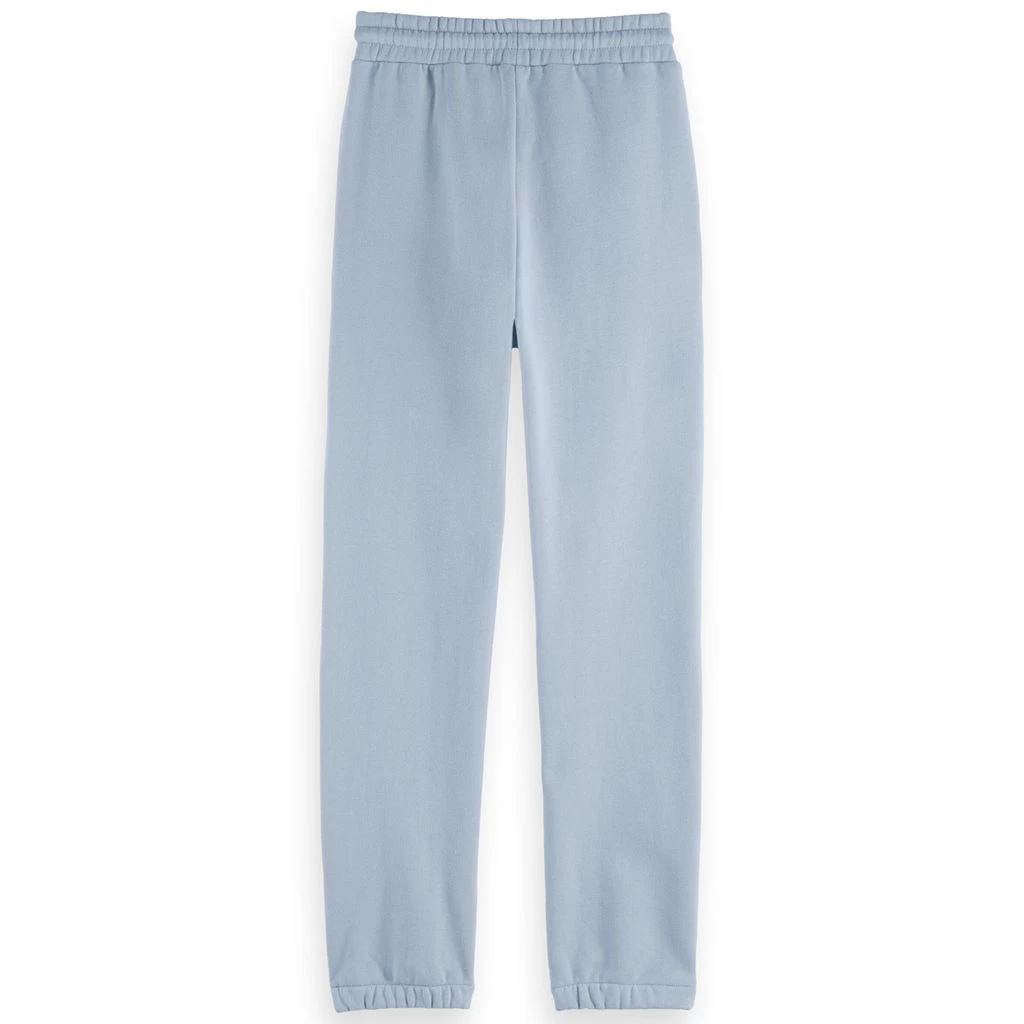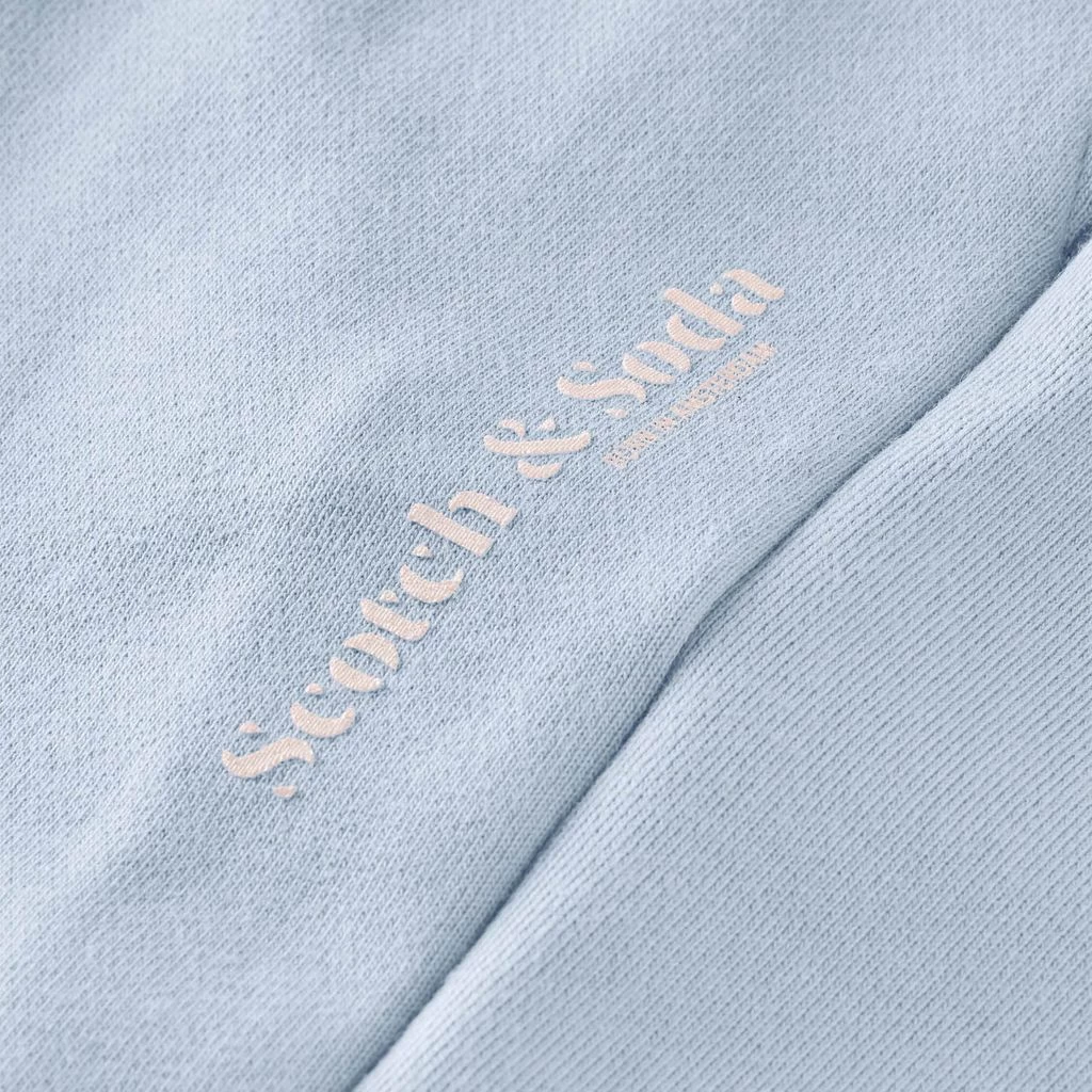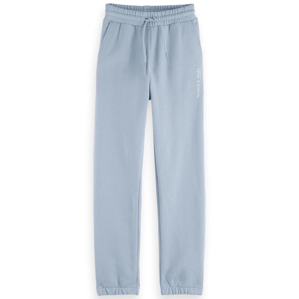 For a cozy and comfy day. Light blue sweatpants by Scotch & Soda. The sweatpants have a relaxed fit. They have a drawstring waist and a printed brand name on the left leg.