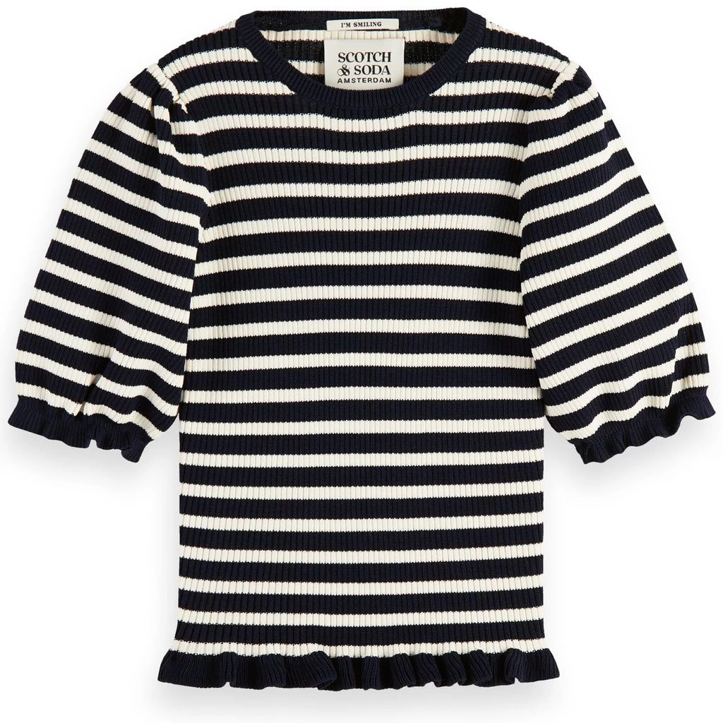 Stripes are so in right now. Wear this T-shirt with pride!. Black T-Shirt by Scotch & Soda. The T-Shirt has a rib-knit design with all-over stripes. It has voluminous sleeves.