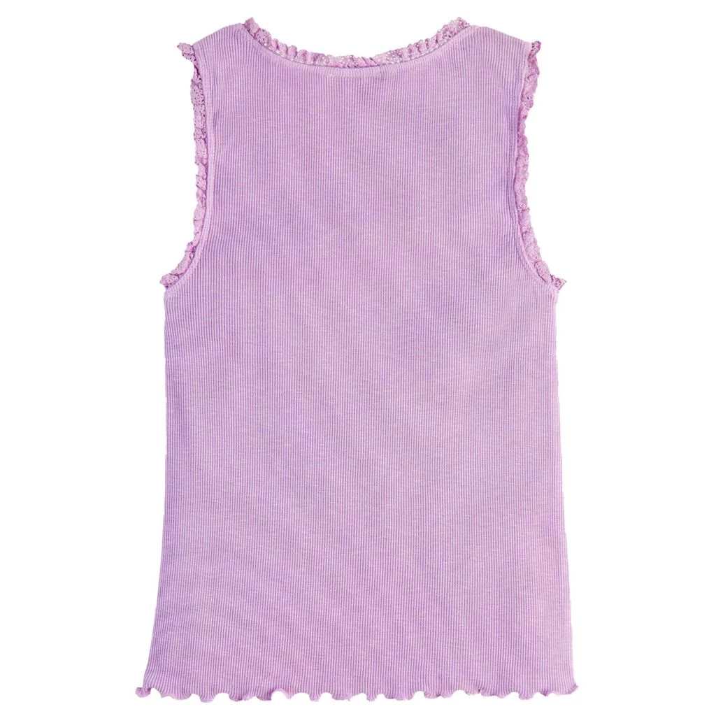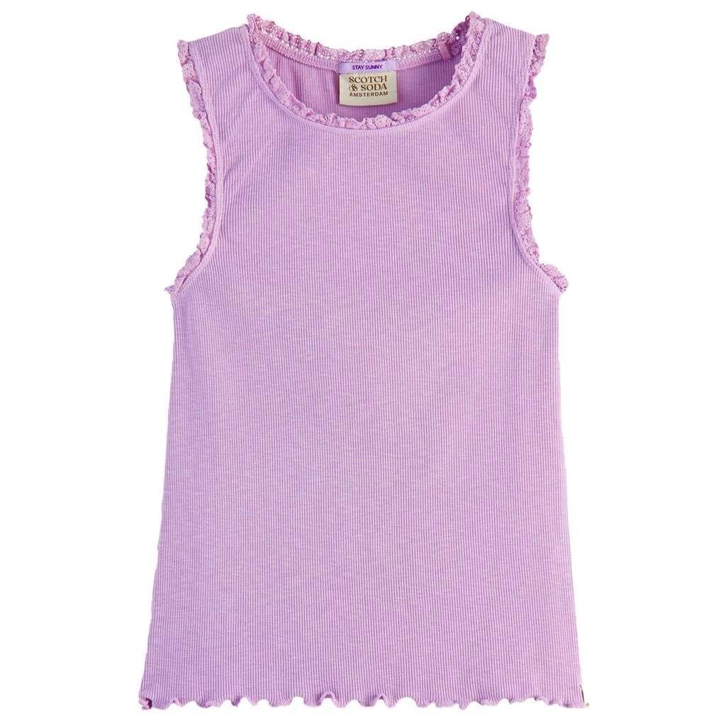 A cute and stylish look. Purple vest by Scotch & Soda. The top has a ribbed design. It has ruffle details.