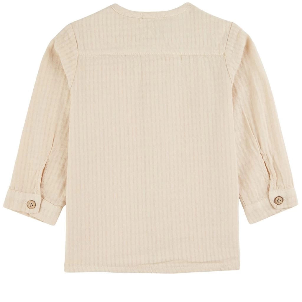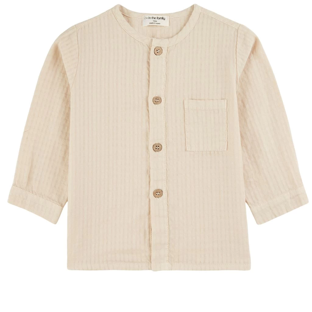 A basic you can’t go wrong with. Beige shirt by 1+ In The Family. The shirt has a button closure at the front. It has a chest pocket.