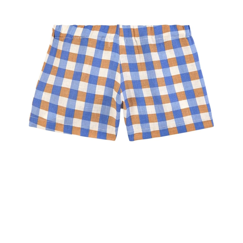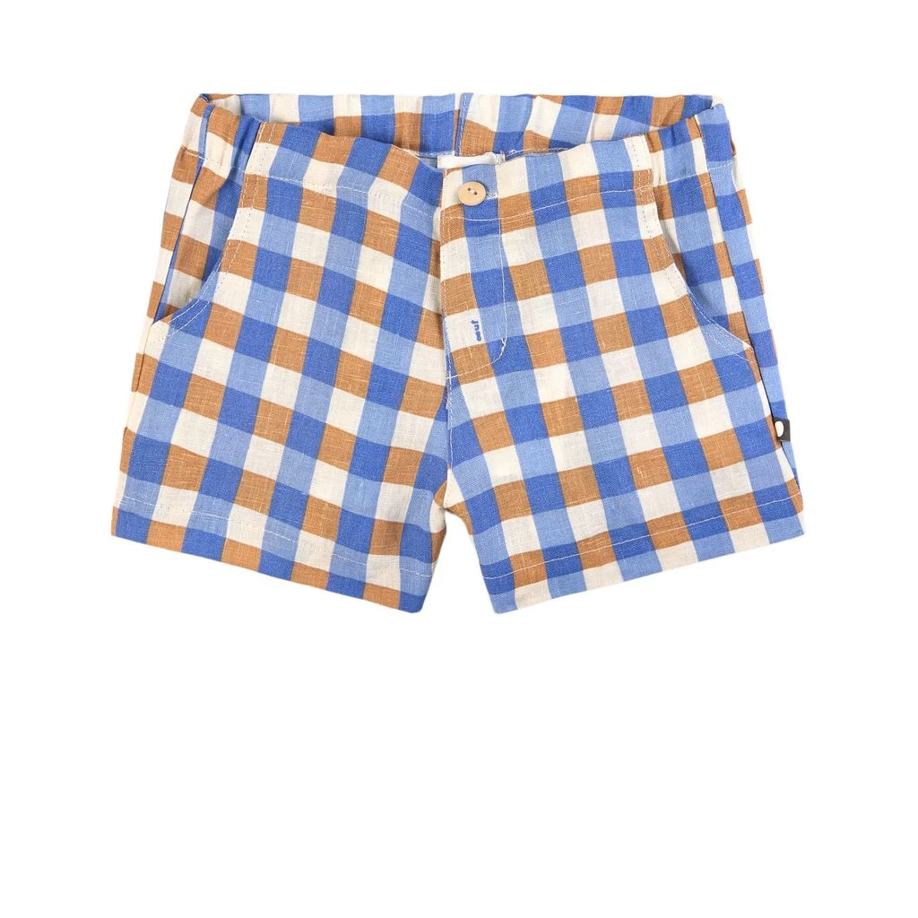 Blue shorts by Oeuf. The shorts have an adjustable button-elastic waist. They have a button closure at the front and two front pockets.
