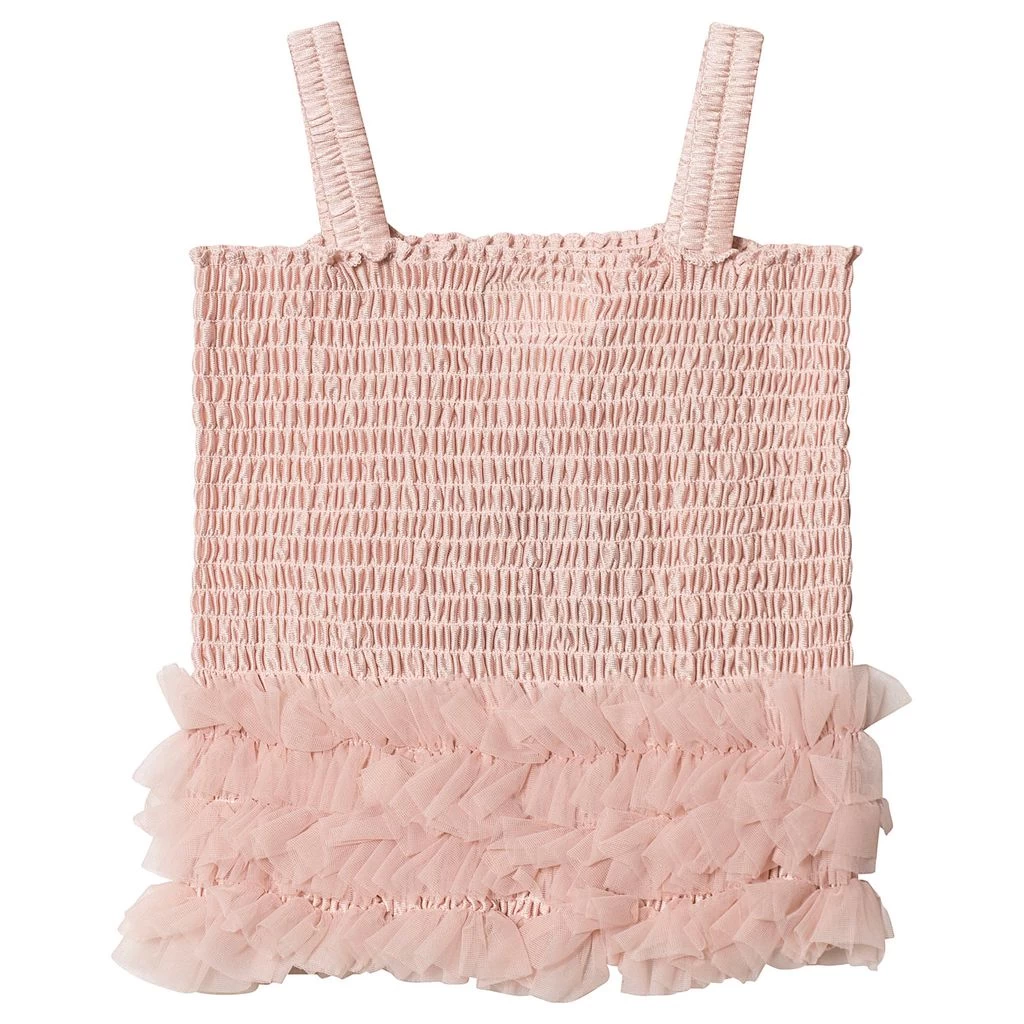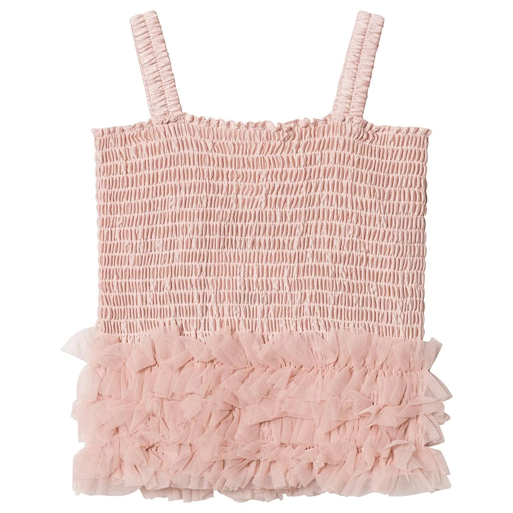 Tank top by Dolly by Le Petit Tom. The top has a smocked design. It has elasticated shoulder straps and tulle ruffles at the hem.