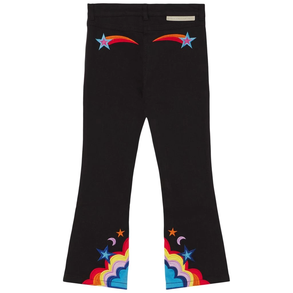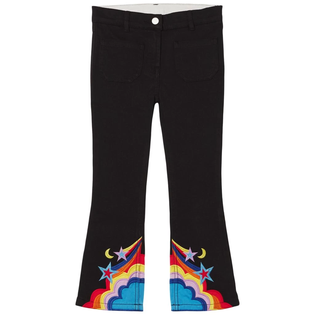 The perfect jeans for any occasion. Black jeans by Stella McCartney Kids. The jeans have an adjustable button-elastic waist. They have a zip fly with button, two front pockets, two back pockets, flared leg ends and colourful embroidery at the leg ends.