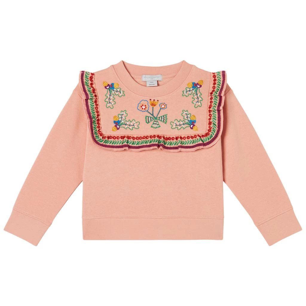 An on-trend and comfortable sweatshirt for everyday life. Pink sweatshirt by Stella McCartney Kids. The sweatshirt has a regular fit. It has ribbed cuffs, embroidered details at the front and ruffles at the front.