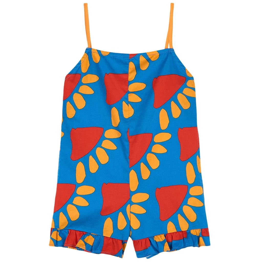 Blue Graphic romper by Stella McCartney Kids. The romper has a key hole opening at the back. It has adjustable spaghetti straps, side seam pockets and ruffled cuffs.