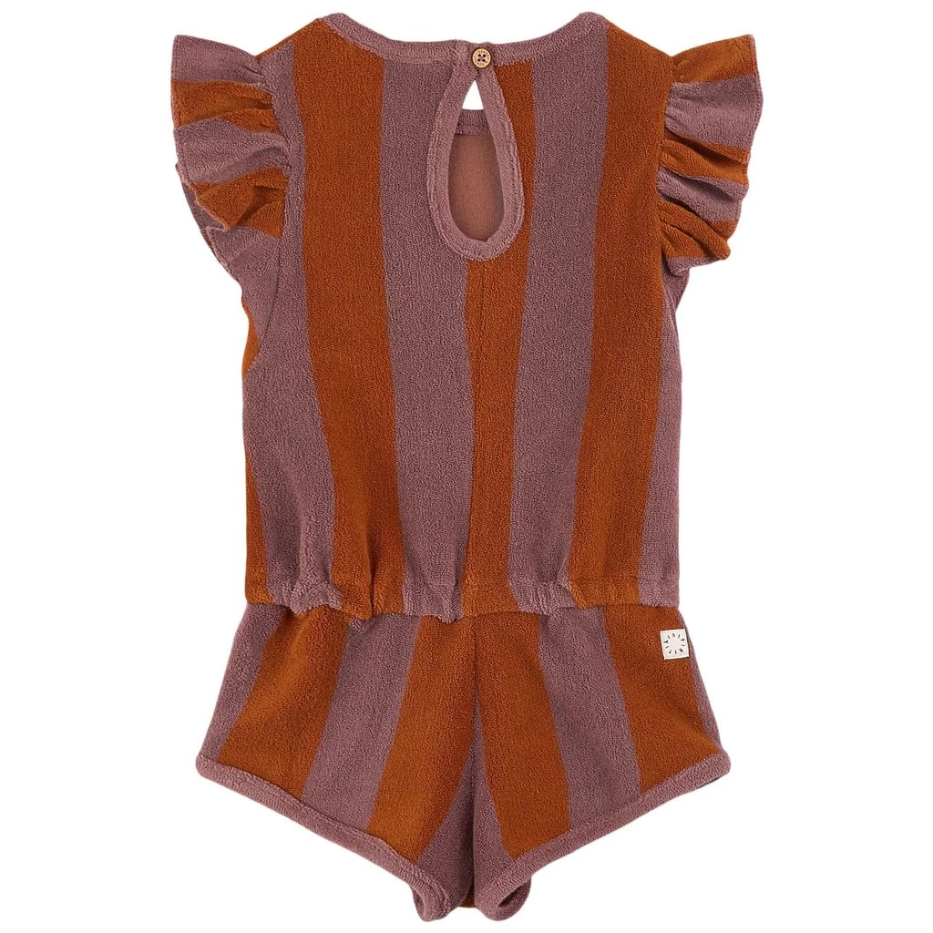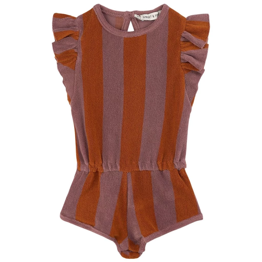 Purple Stripe romper by Sproet and Sprout. The romper has a button closure at the back. It has an elasticated waist and ruffle details.