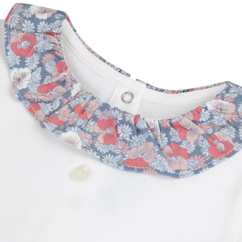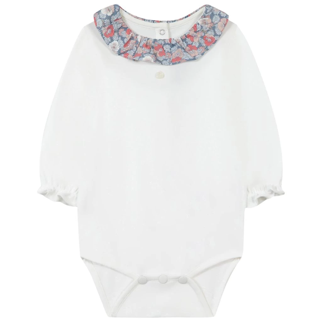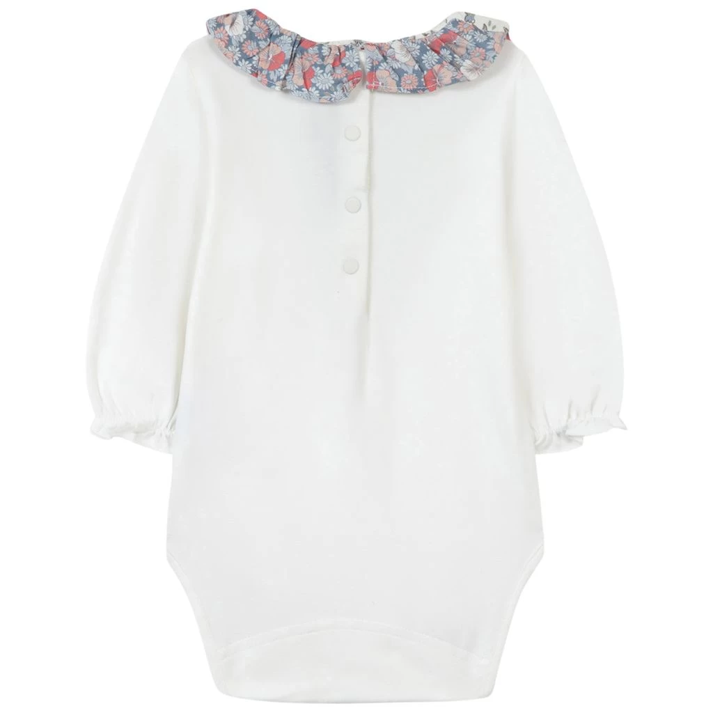 The baby body is not only stylish, but also perfect for practical use. White baby body by Tartine et Chocolat. The baby body has a ruffle collar. It has snap buttons at the back and between the legs.