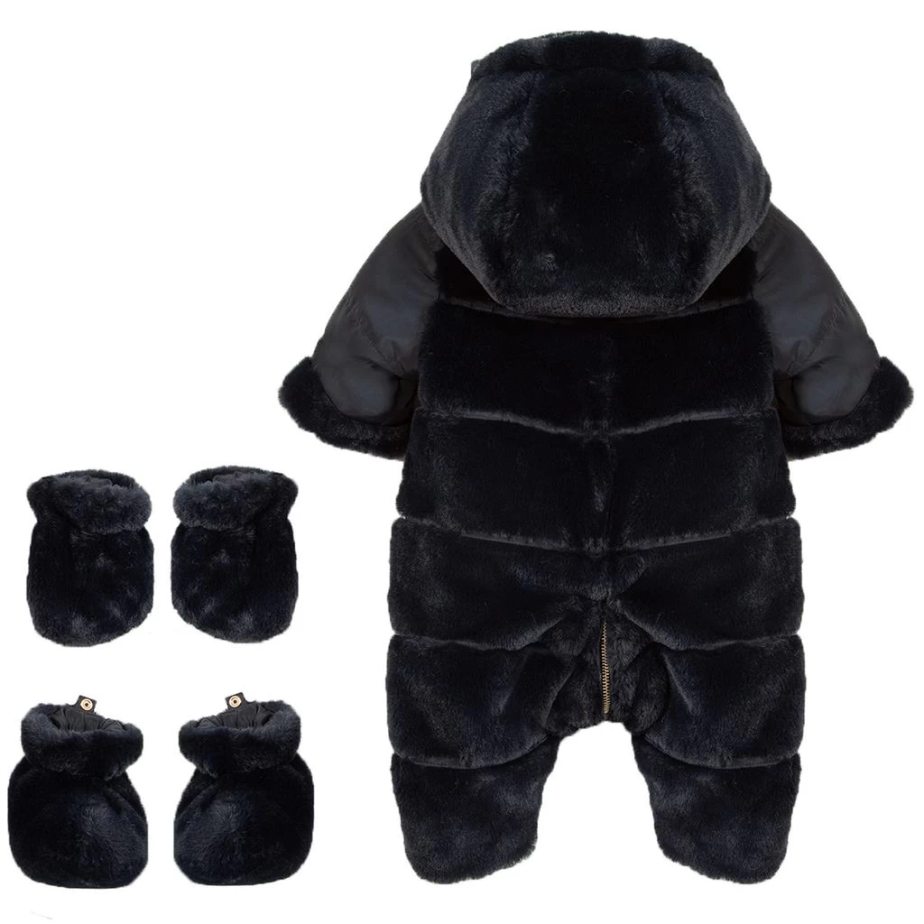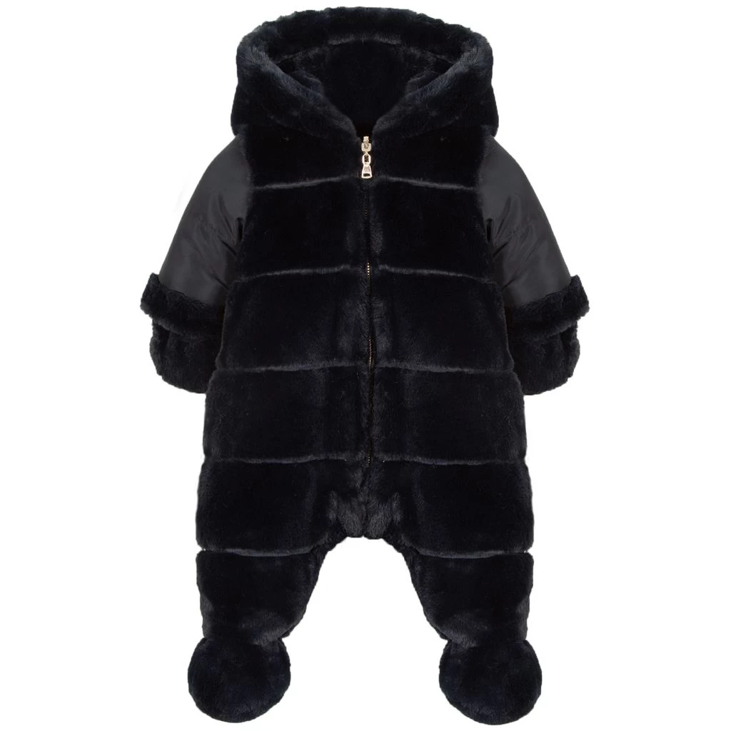 Keep your little baby warm on colder days. Navy baby snowsuit by Tartine et Chocolat. The baby snowsuit has a soft faux-fur material. It has a smooth lining, a fixed hood and a zip closure at the front.
